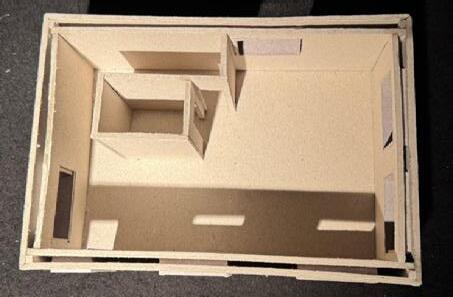An L-shaped staircase will be placed northwest to be more space efficient, and a window next to the stairs on the west wall for lighting, reducing the need for artificial lighting.