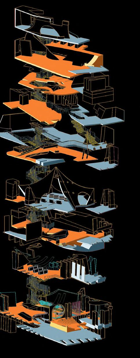 of a double staircase passage, the promenade of thinking, attempts to disperse the flow of people. In order to slow down people's pace, remind of self-thinking, the atmosphere of architecture is a bit cold and solemnity. Life will be guided by the number of cracks, light, and sound of Remixing Process