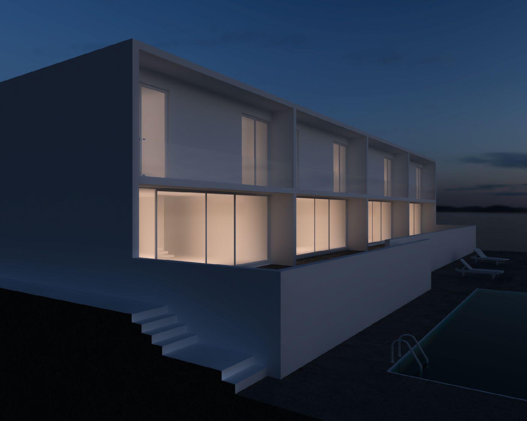 Una imagen de las casas adosadas cuando cae la noche es el atractivo donde el blanco se expande en gran parte de la costa de Pedasí admirar su belleza nos hace sentirnos obligados de vivir en la tranquilidad. La utilización de linternillas para la salida del aire y entrada de luz en los baños del primer nivel como también en la habitación principal cuenta con este mecanismo. Arquitectura introspectiva.