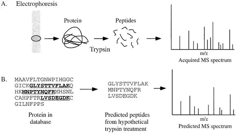 (Peptide Mass Fingerprinting - PMF): Se utiliza generalmente cuando los datos provienen de un espectrómetro MS simple (como MALDI-TOF) tras separar las proteínas por electroforesis en gel (2D-PAGE) El software toma las masas experimentales de los péptidos intactos y las compara con una digestión teórica de todas las proteínas conocidas en una base de datos Si un número estadísticamente significativo de masas coincide, se identifica la proteína.