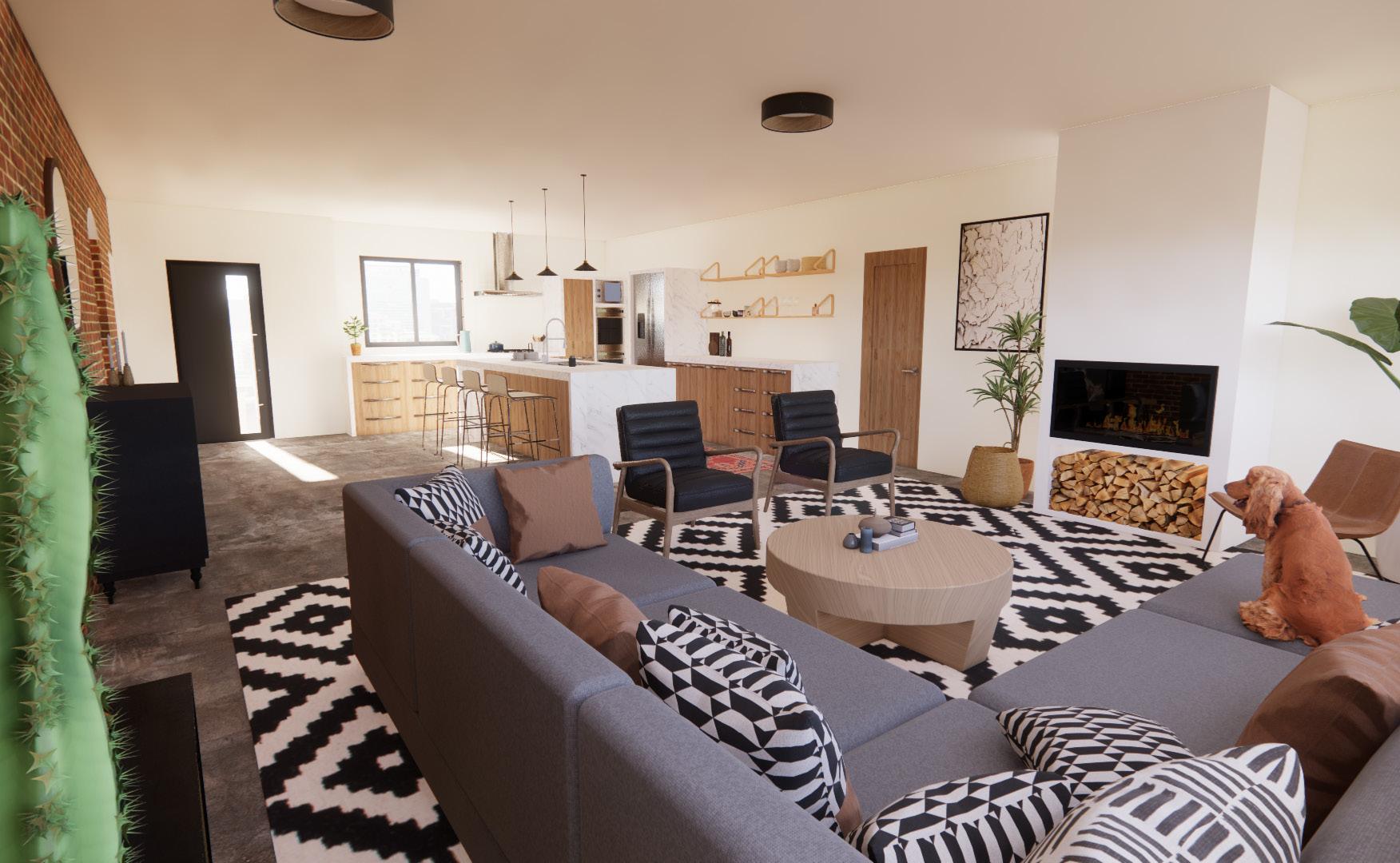 As one of my first interior residential projects, we were given this assignment and floor plan to create a modern penthouse in San Diego. As of more recently, I decided to look back into this project and update new renderings of my original designs. With a passion for residential, I have always been able to show expressions of myself, but aim to create an environment that would feel welcoming to others. The main open floor plan includes a natural-toned modern kitchen and living space leading towards a patio, as well as a primary bedroom with a full bath, and office space and guest powder room. Materials and aesthetics remain minimal, with hints of color and texture throughout.