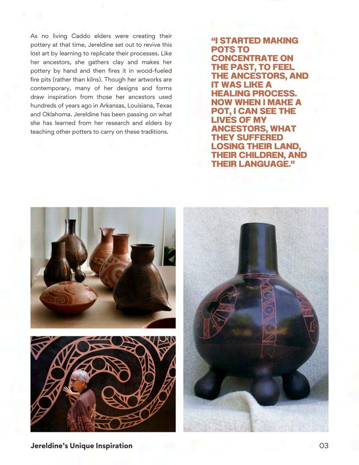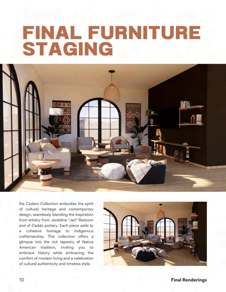 For this assignment, we were expected to use inspiration from an indegenous pottery artist to design a furniture line. I chose to study Jereldine Redcorn and her deep connection to the Caddo tribe. From research, to sketching inspirational furniture, to digitally created the pieces and staging them within a home was an interesting and inspirational process.