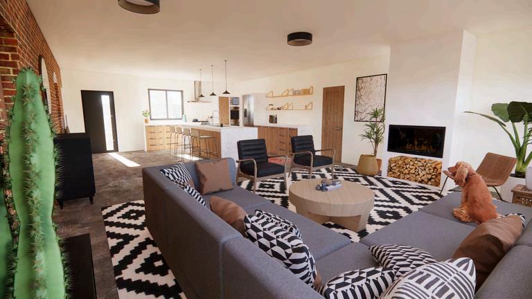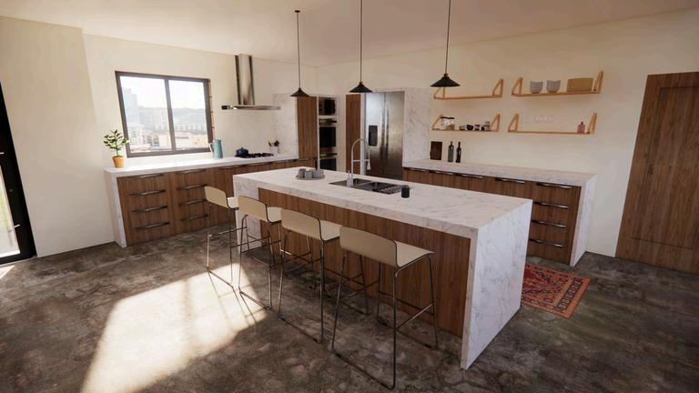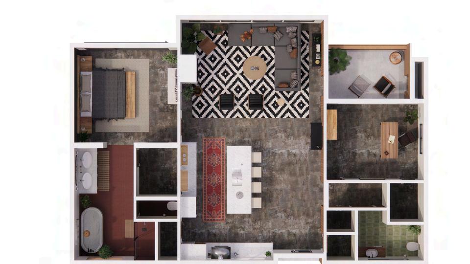 As one of my first interior residential projects, we were given this assignment and floor plan to create a modern penthouse in San Diego. As of more recently, I decided to look back into this project and update new renderings of my original designs. With a passion for residential, I have always been able to show expressions of myself, but aim to create an environment that would feel welcoming to others. The main open floor plan includes a natural-toned modern kitchen and living space leading towards a patio, as well as a primary bedroom with a full bath, and office space and guest powder room. Materials and aesthetics remain minimal, with hints of color and texture throughout.