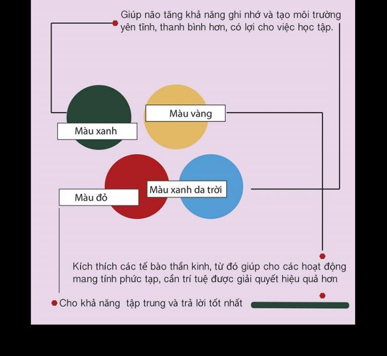 Giải thích về điều này, theo các nhà nghiên cứu: “Màu sắc tươi sáng dường như kích thích các tế bào thần kinh, từ đó giúp cho các hoạt động mang tính phức tạp, cần trí tuệ được giải quyết hiệu quả hơn”. Trong khi đó, nghiên cứu cũng cho thấy, màu xanh và màu xanh lá cây có thể giúp não tăng khả năng ghi nhớ và tạo môi trường yên tĩnh, thanh bình hơn, có lợi cho việc học tập.
