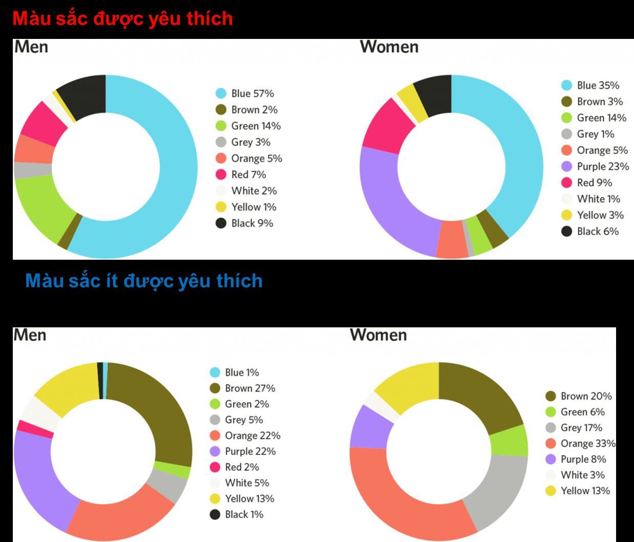 Màu lạnh là màu được ưa thích. Nam giới và phụ nữ đều yêu thích màu xanh dương, xanh lá cây và màu sắc nhẹ nhàng nói chung.