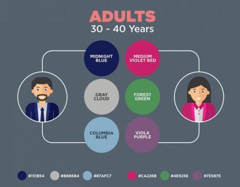 Ở độ tuổi này sở thích về màu sắc tương đối rộng vì vậy tương đối khó để đưa ra các gam màu chung cho độ tuổi này. Nghiên cứu cho thấy đối với nghành nghề khác nhau cũng có xu hướng sở thích khác nhau. Đối với 1 người thích gam màu này vẫn có thể thích một bản thiết kế với gam màu khác nếu nó đủ quyến rũ mê hoặc. Tuy nhiên thường với độ tuổi >50 thì xu hướng màu sắc các gam màu nhạt sáng.