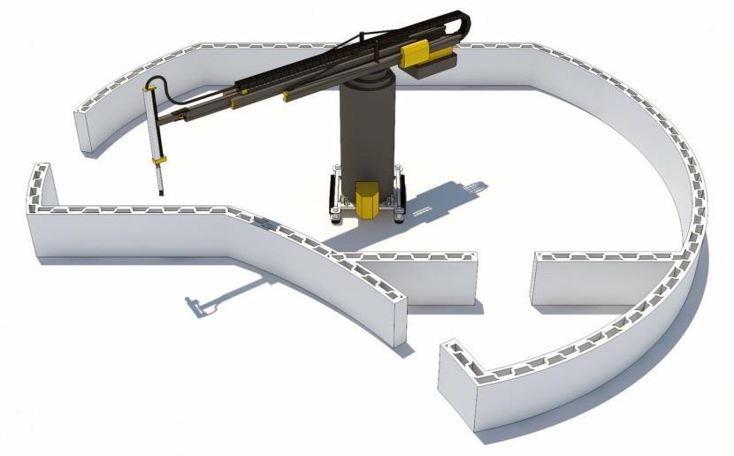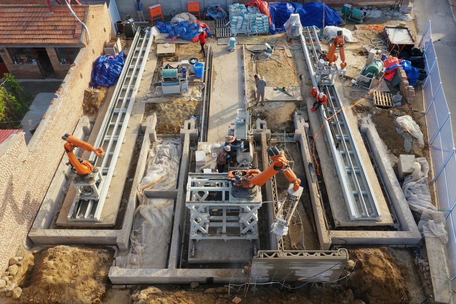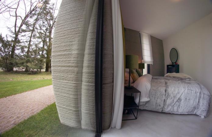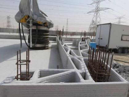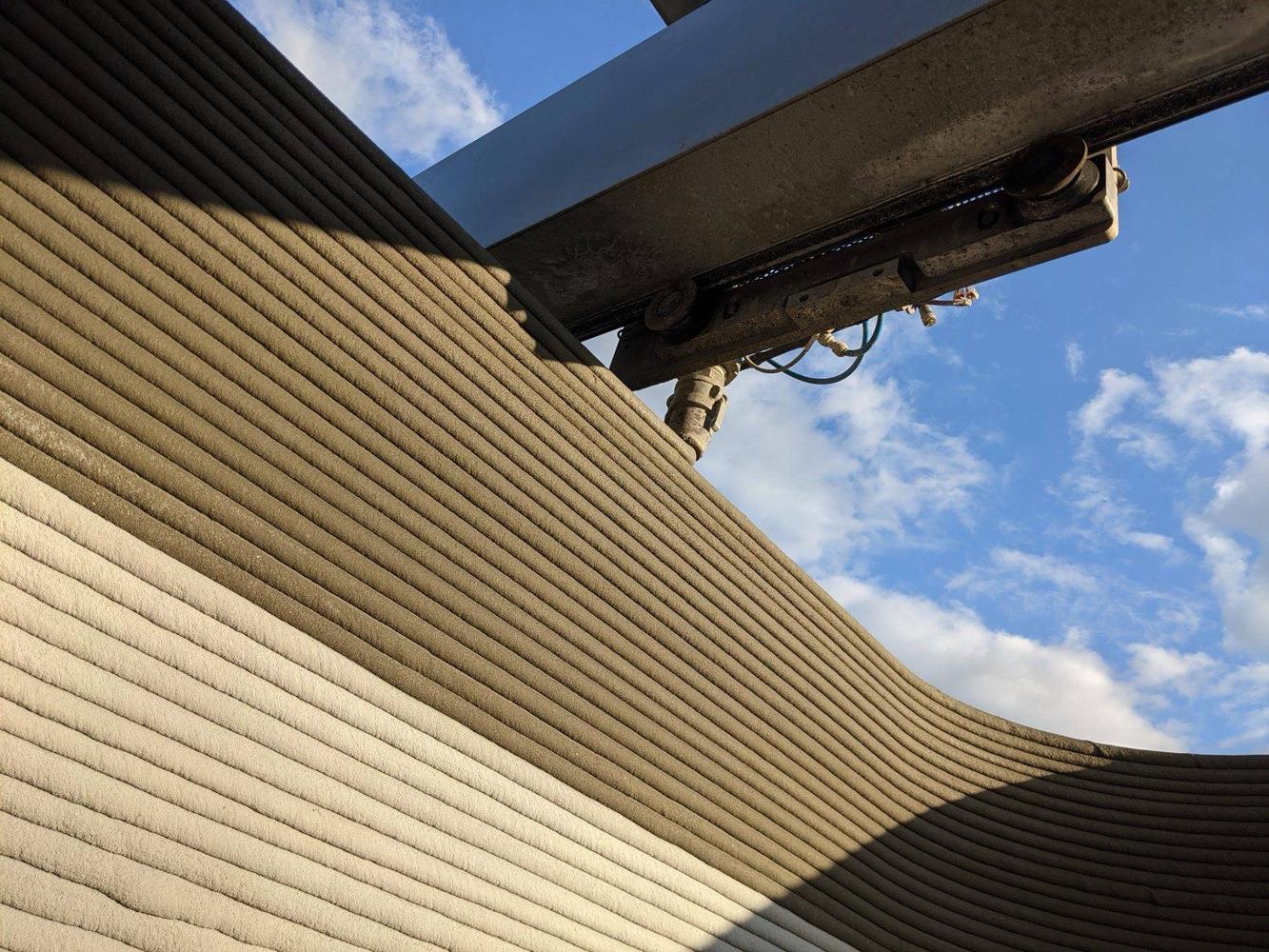• Tòa nhà nằm trên nền móng thông thường và ván khuôn in 3D cho các cột được gia cố bằng bê tông và thép cây.
