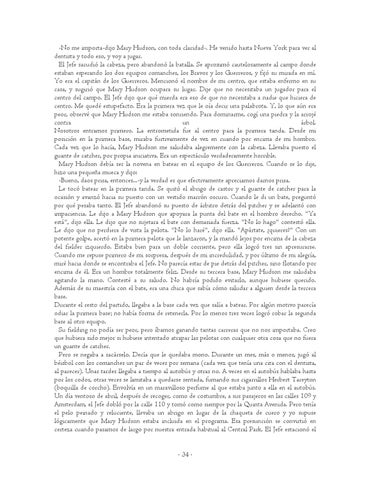 -No me importa-dijo Mary Hudson, con toda claridad-. He venido hasta Nueva York para ver al dentista y todo eso, y voy a jugar. El Jefe sacudió la cabeza, pero abandonó la batalla. Se aproximó cautelosamente al campo donde estaban esperando los dos equipos comanches, los Bravos y los Guerreros, y fijó su mirada en mí. Yo era el capitán de los Guerreros. Mencionó el nombre de mi centro, que estaba enfermo en su casa, y sugirió que Mary Hudson ocupara su lugar. Dije que no necesitaba un jugador para el centro del campo. El Jefe dijo que qué mierda era eso de que no necesitaba a nadie que hiciera de centro. Me quedé estupefacto. Era la primera vez que le oía decir una palabrota. Y, lo que aún era peor, observé que Mary Hudson me estaba sonriendo. Para dominarme, cogí una piedra y la arrojé contra un árbol. Nosotros entramos primero. La entrometida fue al centro para la primera tanda. Desde mi posición en la primera base, miraba furtivamente de vez en cuando por encima de mi hombro. Cada vez que lo hacía, Mary Hudson me saludaba alegremente con la cabeza. Llevaba puesto el guante de catcher, por propia iniciativa. Era un espectáculo verdaderamente horrible. Mary Hudson debía ser la novena en batear en el equipo de los Guerreros. Cuando se lo dije, hizo una pequeña mueca y dijo: -Bueno, daos prisa, entonces...-y la verdad es que efectivamente apreciamos darnos prisa. Le tocó batear en la primera tanda. Se quitó el abrigo de castor y el guante de catcher para la ocasión y avanzó hacia su puesto con un vestido marrón oscuro. Cuando le di un bate, preguntó por qué pesaba tanto. El Jefe abandonó su puesto de árbitro detrás del pitcher y se adelantó con impaciencia. Le dijo a Mary Hudson que apoyara la punta del bate en el hombro derecho. "Ya está", dijo ella. Le dijo que no sujetara el bate con demasiada fuerza. "No lo hago" contestó ella. Le dijo que no perdiera de vista la pelota. "No lo haré", dijo ella. "Apártate, ¿quieres?" Con un potente golpe, acertó en la primera pelota que le lanzaron, y la mandó lejos por encima de la cabeza del fielder izquierdo. Estaba bien para un doble corriente, pero ella logró tres sin apresurarse. Cuando me repuse primero de mi sorpresa, después de mi incredulidad, y por último de mi alegría, miré hacia donde se encontraba el Jefe. No parecía estar de pie detrás del pitcher, sino flotando por encima de él. Era un hombre totalmente feliz. Desde su tercera base, Mary Hudson me saludaba agitando la mano. Contesté a su saludo. No habría podido evitarlo, aunque hubiese querido. Además de su maestría con el bate, era una chica que sabía cómo saludar a alguien desde la tercera base. Durante el resto del partido, llegaba a la base cada vez que salía a batear. Por algún motivo parecía odiar la primera base; no había forma de retenerla. Por lo menos tres veces logró robar la segunda base al otro equipo. Su fielding no podía ser peor, pero íbamos ganando tantas carreras que no nos importaba. Creo que hubiera sido mejor si hubiese intentado atrapar las pelotas con cualquier otra cosa que no fuera un guante de catcher. Pero se negaba a sacárselo. Decía que le quedaba mono. Durante un mes, más o menos, jugó al béisbol con los comanches un par de veces por semana (cada vez que tenía una cita con el dentista, al parecer). Unas tardes llegaba a tiempo al autobús y otras no. A veces en el autobús hablaba hasta por los codos, otras veces se limitaba a quedarse sentada, fumando sus cigarrillos Herbert Tareyton (boquilla de corcho). Envolvía en un maravilloso perfume al que estaba junto a ella en el autobús. Un día ventoso de abril, después de recoger, como de costumbre, a sus pasajeros en las calles 109 y Amsterdam, el Jefe dobló por la calle 110 y tomó como siempre por la Quinta Avenida. Pero tenía el pelo peinado y reluciente, llevaba un abrigo en lugar de la chaqueta de cuero y yo supuse lógicamente que Mary Hudson estaba incluida en el programa. Esa presunción se convirtió en certeza cuando pasamos de largo por nuestra entrada habitual al Central Park. El Jefe estacionó el · 34 ·