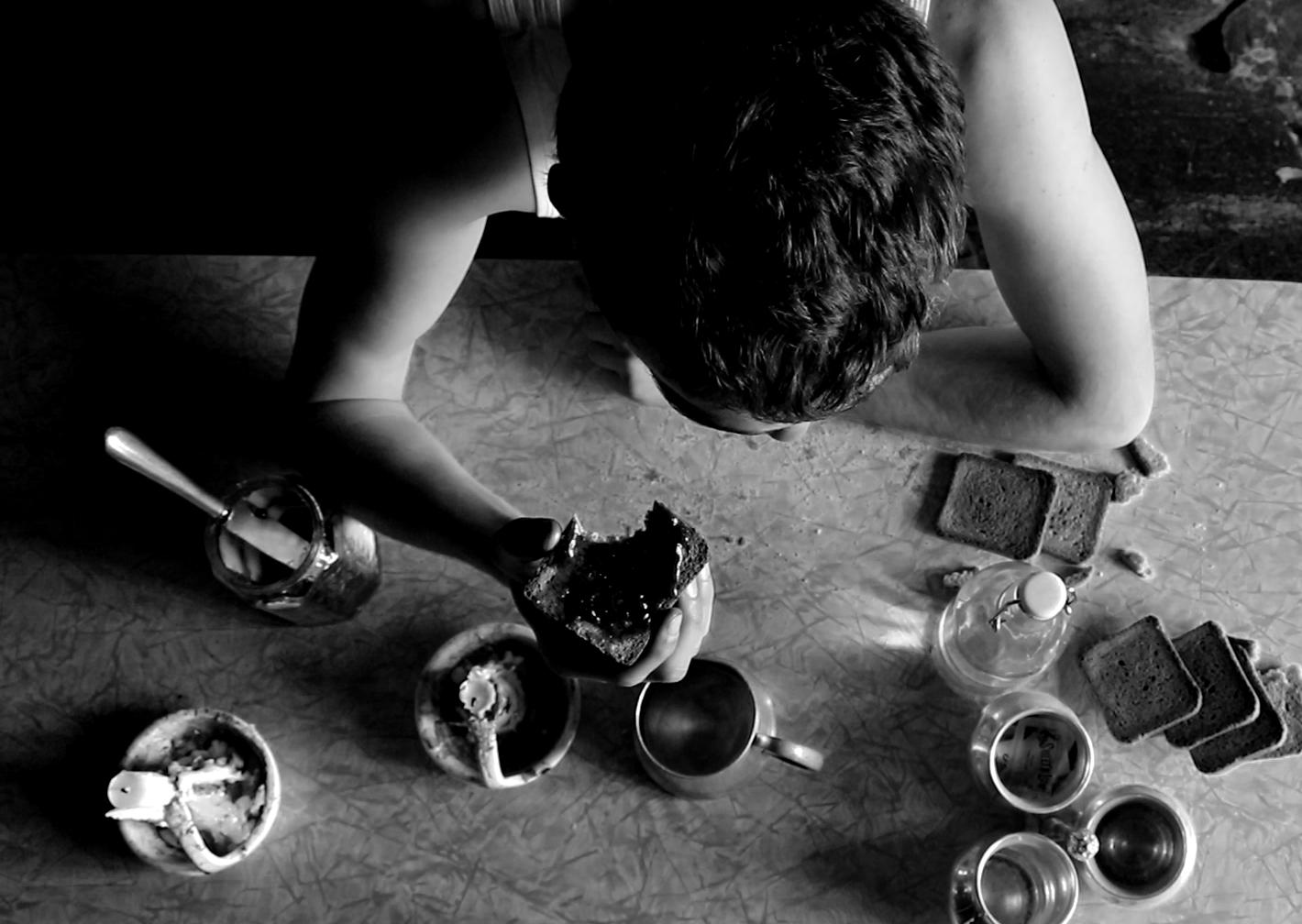 Il giovane si prepara la colazione con fetta biscottata e marmellata, il suono del coltello sulla fetta secca denota la solitudine del protagonista