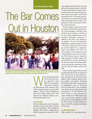 hy was Houston the first city in Texas where lawyers organized a local LGBT bar association? The answer is rooted in the 1960s and the 1970s, when the City’s LGBT community began to step out of the shadows. Old laws, which included the 1860 Texas sodomy statute1 and a 1904 Houston city ordinance banning crossdressing, also played a part.2 Early Struggles Both the sodomy and cross-dressing laws provided excuses for the police to harass gay men and lesbians. This included an infamous 1967 raid on a lesbian bar in which 25 patrons were arrested. In 1973, 24