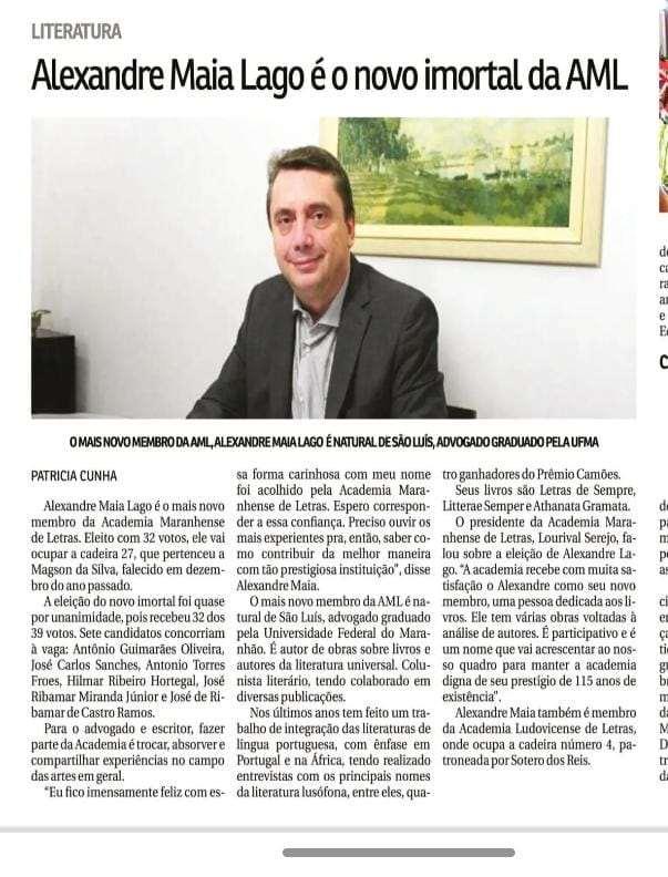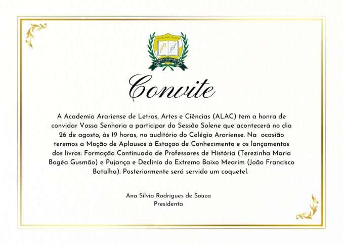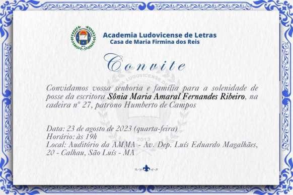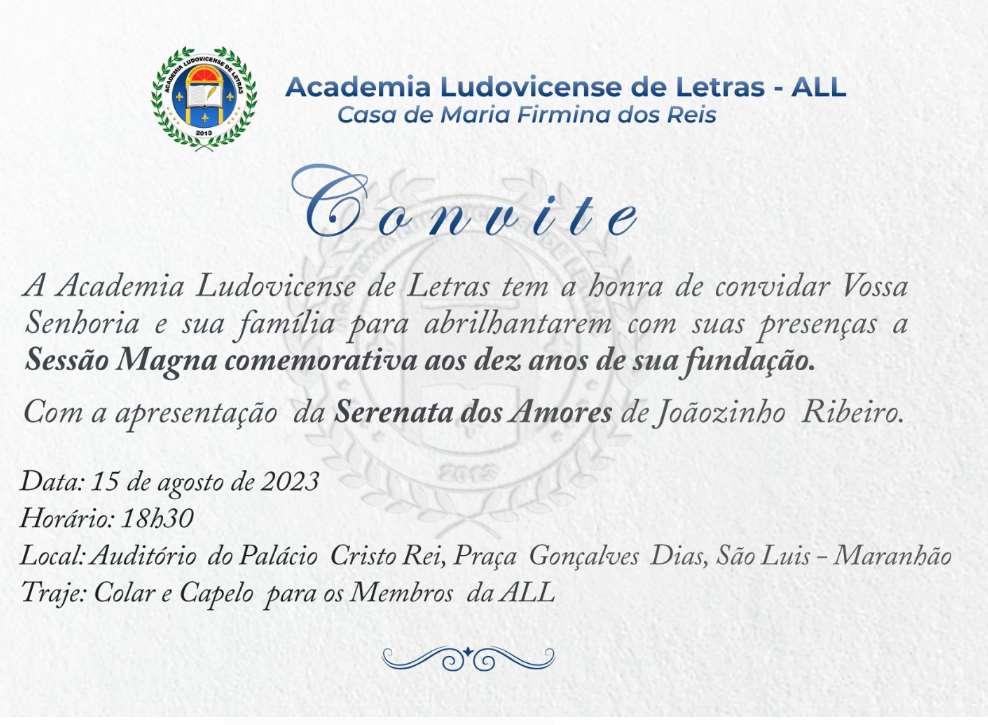 A Presidente da Academia Ludovicense de Letras – ALL, no uso das suas atribuições estatutárias, convoca os Senhores(as) Acadêmicos(as) a participarem da Assembleia Geral Ordinária (AGO), a realizar-se no dia 25 de agosto de 2023, sexta feira,as17horas,tendoporlocalasaladereuniãodaALL,noPalácioCristoRei,sitoàPraçaGonçalves Dias, nº. 351, São Luís-Maranhão, para tratar da seguinte pauta: