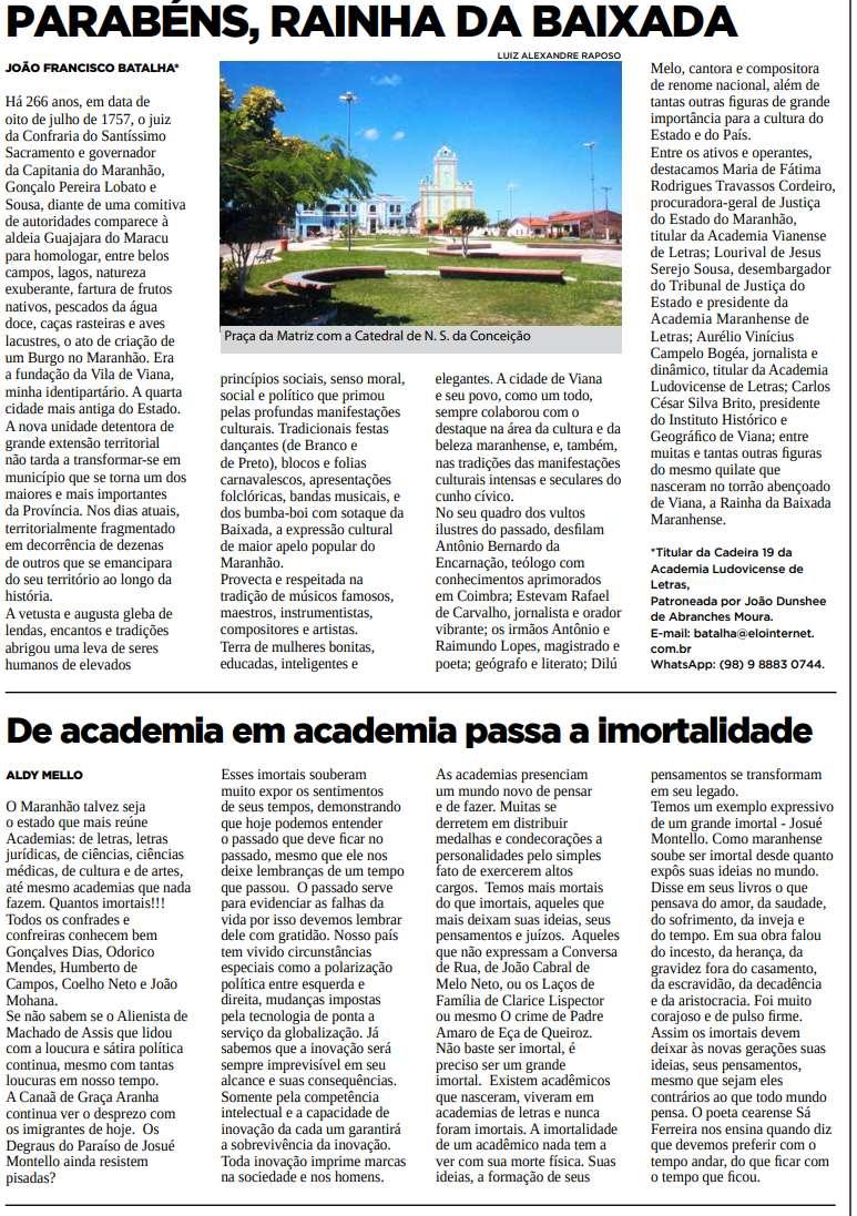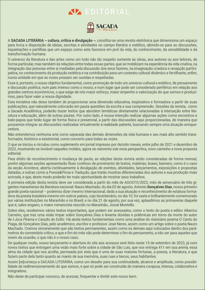 A dúvida do Editor é: o que colocar na edição... temos colaboradores que escrevem todas as semanas, e publicam em jornais locais e outras mídias sociais; temos colaboradores que escrevem todos os dias, e disponibilizam. Muitas das matérias expostas, não se referem à literatura ludovicense/maranhense; são opinativas, crônicas, registros dos acontecimentos políticos diários, quando incomodam. E se manifestam... outras, se referem à artigos técnicos, em sua maioria jurídicos, dada a principal ocupação do escrevinhador... a dúvida é: colocar, ou não, esses artigos técnicos, não literários, não de crítica literária... outros, escrevem sobre literatura universal, autores consagrados, em análise de suas obras... vale o registro? Já que o principal objetivo da academia, e seus meios de divulgação,, são, preferentemente, a ludovicense e a maranhense... quando a edição ultrapassa o numero permitido de páginas para publicação, sem pagamento de taxas extras para tal – ocupação do espaço – tenho cortado meus escritos – o que também não é correto, pois escrevo... mas tenho outros meios de divulgar minhas matérias, como as duas revistas que edito: a Revista do Léo, e a Maranha-y, além do CEV. Mas fica a dúvida: devo sacrificar um assunto pertinente à memória/história do Maranhão, em detrimento de um artigo técnico-jurídico? Ou de literatura, análise crítica, de um autor de fora? O dilema fica...