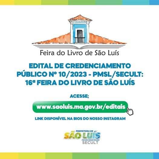 A Prefeitura Municipal de São Luís, por meio da Secretaria Municipal de Cultura (Secult), órgão gestor da política municipal de Cultura, torna público, que estão abertas as inscrições para o credenciamento de organizações da sociedade civil, visando o planejamento e execução da 16ª Feira do Livro de São Luís em parceria com a Secretaria de Educação do Município.