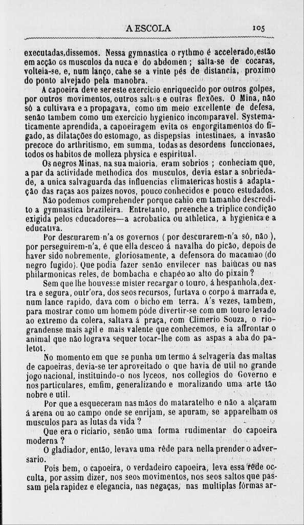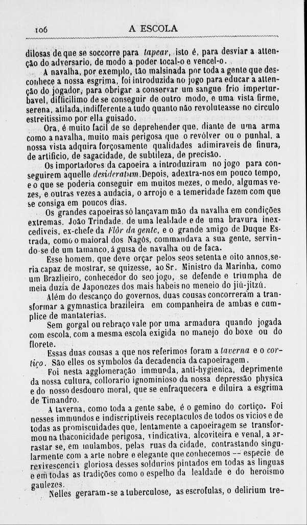 11 [...] Muitos dos mais influentes personagens da história do Brasil e da capoeira estudaram no Colégio Pedro II, existindo informações sobre a prática da Capoeira entre eles. O ano de 1841 é considerado como o marco inicial da história da gymnastica no Colégio Pedro Segundo. Exatamente no dia nove de setembro, Guilherme Luiz de Taube, ex-capitão do Exército Imperial, entrou em exercício no cargo de mestre de gymnastica do Colégio. In CUNHA JR, C F F. Organização e cotidiano escolar da “Gymnastica” - uma história no Imperial Collegio de Pedro Segundo. Perspectiva, Florianópolis, v. 22, n. Especial, p. 163-195, jul./dez. 2004 on line, disponível em http://eu-bras.blogspot.com/search/label/1841-Gymnasia%20militar%20en%20el%20Colegio%20Pedro%20II 12 PASSOS, Caio. Cada rua sua história. Parnaíba: [s.n.], 1982. citado por , SILVA, Rozenilda Maria de Castro COMPANHIA DE APRENDIZES MARINHEIROS DO PIAUÍ E A SUA RELAÇÃO COM O COTIDIANO DA CIDADE DE PARNAÍBA. on line, http://www.ufpi.br/mesteduc/eventos/ivencontro/GT10/companhia_aprendizes.pdf 13 COSTA, Neuber Leite CAPOEIRA, TRABALHO E EDUCAÇÃO. Dissertação (mestrado) – Universidade Federal da Bahia. Faculdade de Educação, 2007.