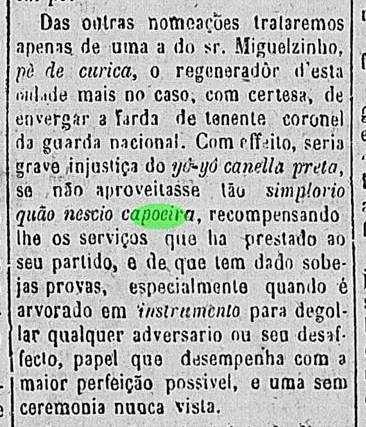 No jornal “A Época”, órgão conservador, disponível os números de 1878 a 1884, se encontram dez referencias sobre ‘capoeira’, nem sempre relacionadas com capoeiristas e capoeiragem. Na edição de 7 de maio de 1880, por exemplo, ao referirem-se alguns queixosos sobre a atuação do Juiz e das tropas regulares em Jaicó, identifica o Juiz como um cínico, afirmando ‘Que capoeira? Como sabe ser estupidamente cínico.’
