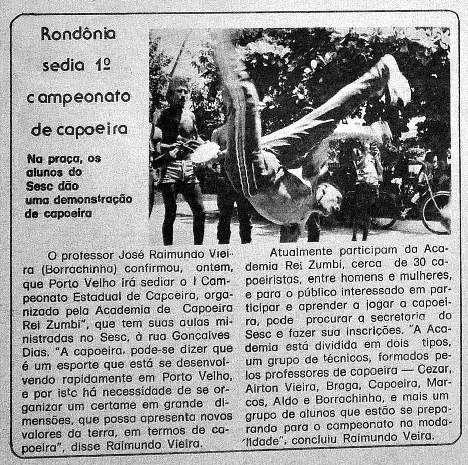 2021 - História da capoeira em Rondônia resgatada em documentário e revista - News Rondonia Portal de NoticiasAs primeiras manifestações mais expressivas apontam para a década de 40, no ciclo da borracha. Não há um estudo oficial sobre a origem da capoeira em Rondônia. Contudo, com base em fontes disponíveis, pesquisas correlacionadas, depoimentos de personagens e pesquisadores, A Federação de Capoeira de Rondônia (Fecaron) e a Associação Portovelhense de Capoeira (Arca) vem realizando há anos um trabalho de resgate da história da capoeira, catalogando registros e documentos e mapeando a linha do tempo. O resultado é um vídeo-documentário e uma revista, que surgem como as maiores fontes sobre a capoeira em Rondônia.