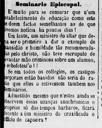 Passemos aos registros do Jornal “O Apóstolo”, disponíveis os anos de 1907 a 1912, com seis ocorrências. As do ano de 1909 – a partir de outubro – se referem à capoeira como mato, necessitando de a cidade ser remodelada, eliminando-se “essas capoeiras”, em críticas à proposta do novo Governador de ajardinar a cidade. Outros, a terrenos pertencentes a alguém, e que estaria sendo invadido. Mas há referencia também à prática da “capoeira” a que nos referimos, enquanto arte-luta, como esse comentário: