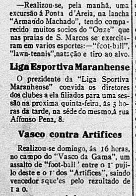 A nota "chic" do Domingo, foi o jogo entre o Bragança Sport Club e o Ubirajara Foot Ball Club: os jogadores do Bragança, às 14 horas, apresentaram se na gare da ferro Carril para dirigirem se ao longínquo Anil em bond especial. A viagem durou uma hora... O jogo, terminou empatado em 2 x 2, frustrando o grande público e as senhoritas presentes, que esperavam uma vitória do Ubirajara, para ofertar aos players, bouquets de flores.