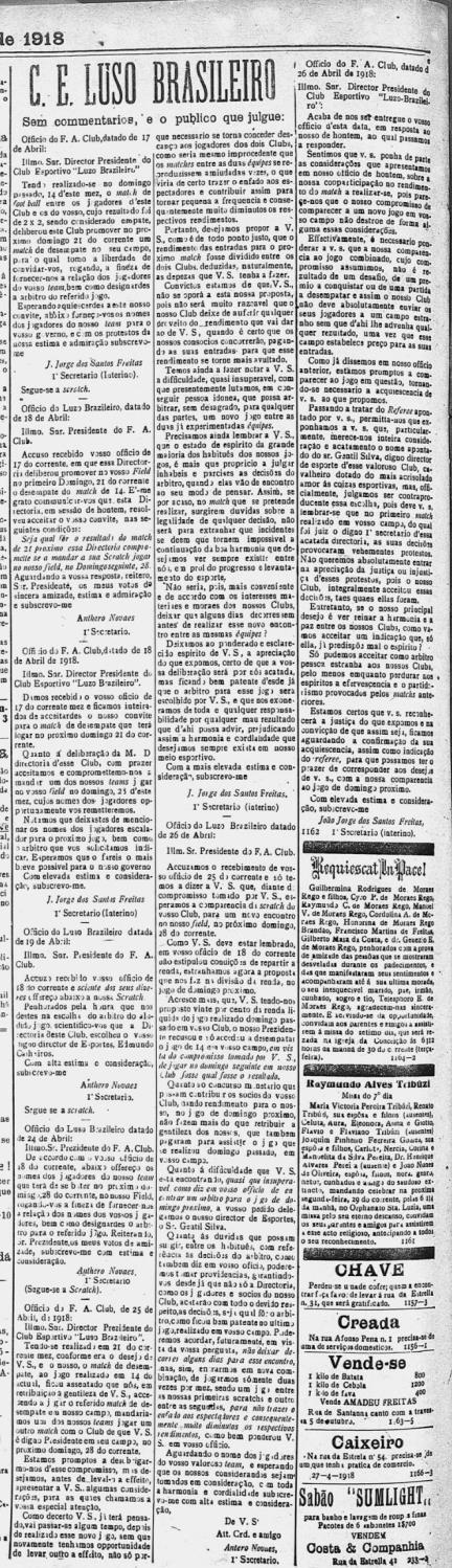 1917 O encontro entre os infantis do mais dois clubes conhecidos BOTAFOGO FOOT BALL CLUBE e o do P.F. termina em 1 x 1, em jogo realizado no campo do Ubirajara, no Anil (O ESTADO, 16 de janeiro de 1917).