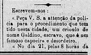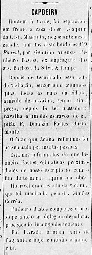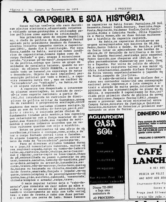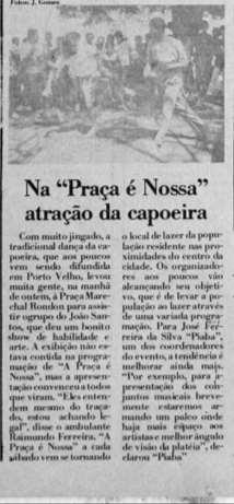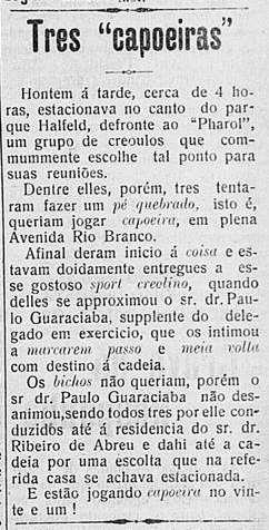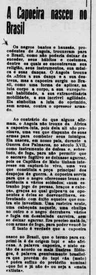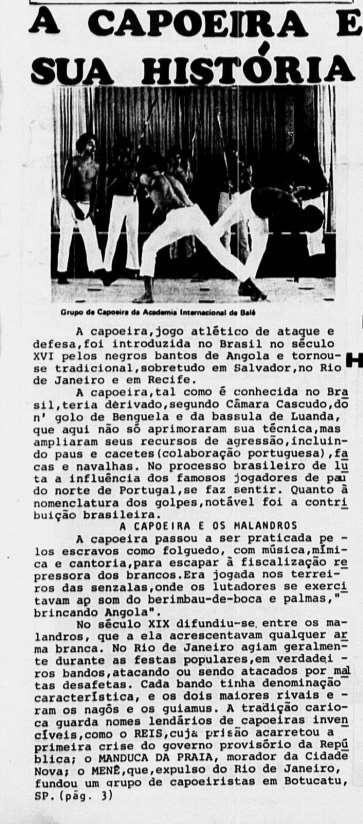 O interessante, quando se busca a História da Capoeira, a grande maioria dos Mestres – e dos estudos acadêmicos – se referem ao seu início a partir dos anos 70, ignorando mais de século de prática e evolução... Delutadramática,passou paraarte,dança,folclore...comopreferemos adeptosdaAngola; masnãose cansam de pedir subsídios aos esportes, para se manterem... enfim, como devemos tratá-la? Atividade física, luta marcial? Ou como dança, cultura, folclore? Afinal, o que é a capoeira?