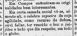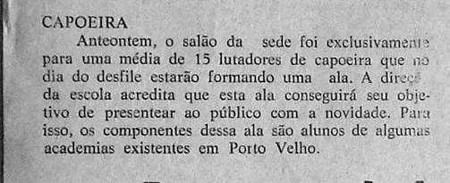 Dando continuidade à busca de “cada quá em seu cada quá”: quando a Capoeiragem começou... nos diversos Estados brasileiros; alguns fatos surpreendentes!!! Outros, nem tanto – as primeiras referências ao termo de busca ‘capoeira’ nos trazem referencias à mato, em seguida, à galinhas (transporte), e à política, com a nomeação de políticos, e seus atos, de traição, rasteira, comportamento ‘de capoeira’, e por fim, dos ‘capoeiras’. Sempre ligados a crimes, malandragem, vadiagem... algumas poucas referencias, antes do século XX, de luta, combate, arte, competição... e a recomendação de uso pelas forças armadas como luta de defesa; e, dos anos 1900, após a década de 30, aparece a sistematização do seu ensino, e a ‘descoberta’ do folclore, da atividade física, e só aí apararecem a Angola, a Regional. E dos anos 1960/70 em diante, a ‘globalização’, com a diáspora dos mestres baianos... A ‘academização’ da Capoeira... Passa de ‘capoeiragem’ – uma briga dramática de rua, no dizer de Lacé Lopes – para ‘capoeira’ - de academias -, mas mantendo as ‘apresentações’ de rua, mais ligadas ao folclore...