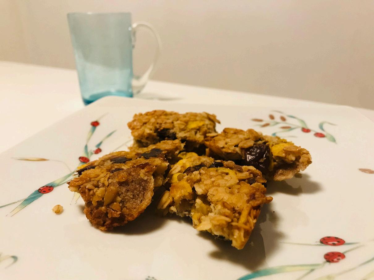 secs (abricots, raisins secs, cranberries...) et des graines de courge. Grande plaque de barres de céréales à banane