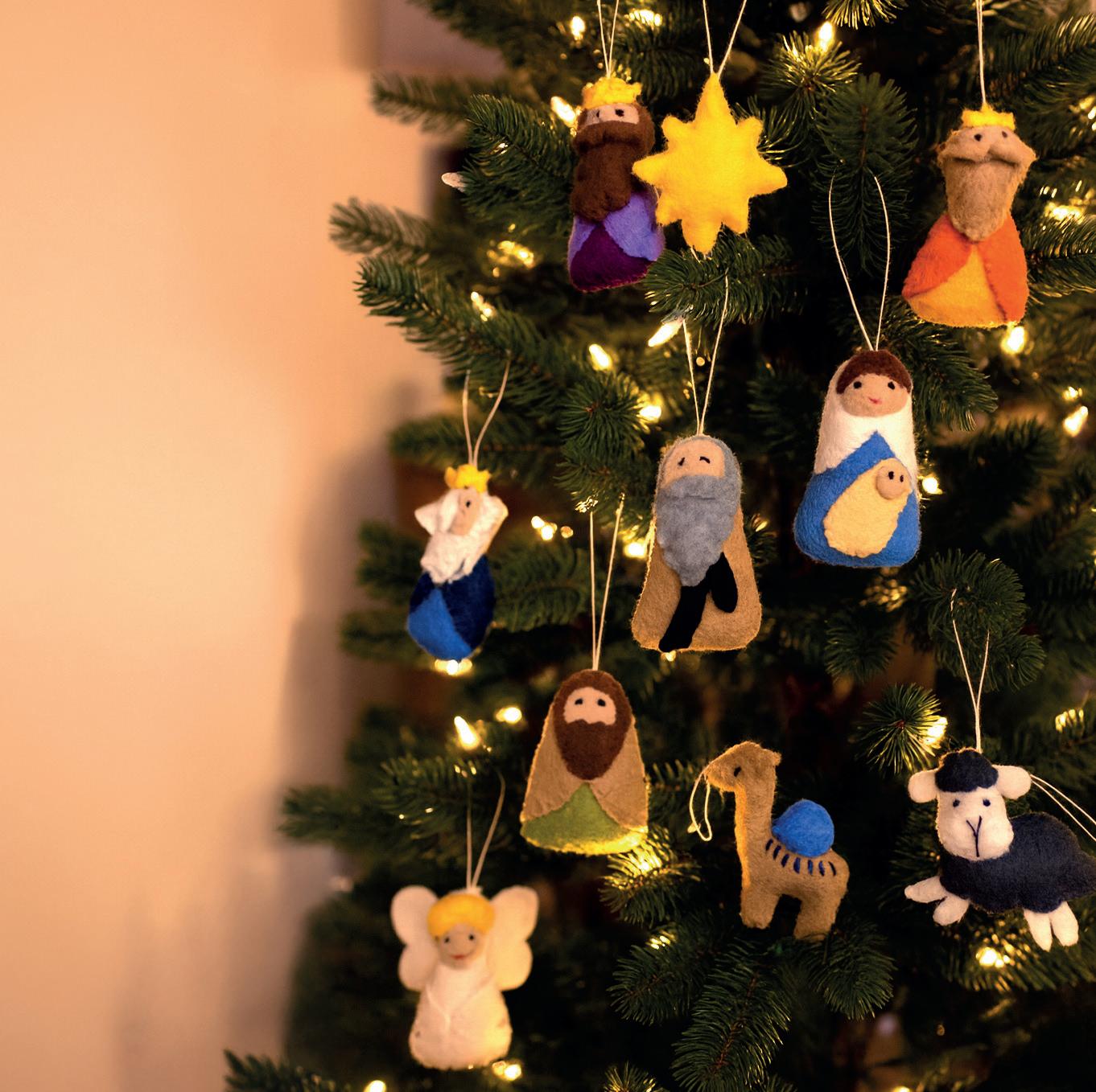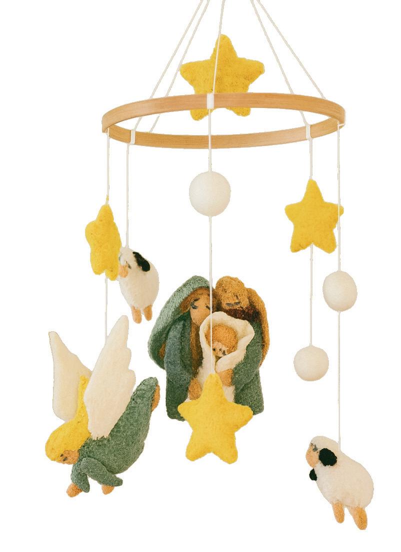 Felt nativity scene hanging mobile ornament by artisans living with leprosy and disability in Nepal. Wooden ring 21 x 21cm. Packaging box 23 x 22cm. Figures range from 3- 11cm. Ages 0+.