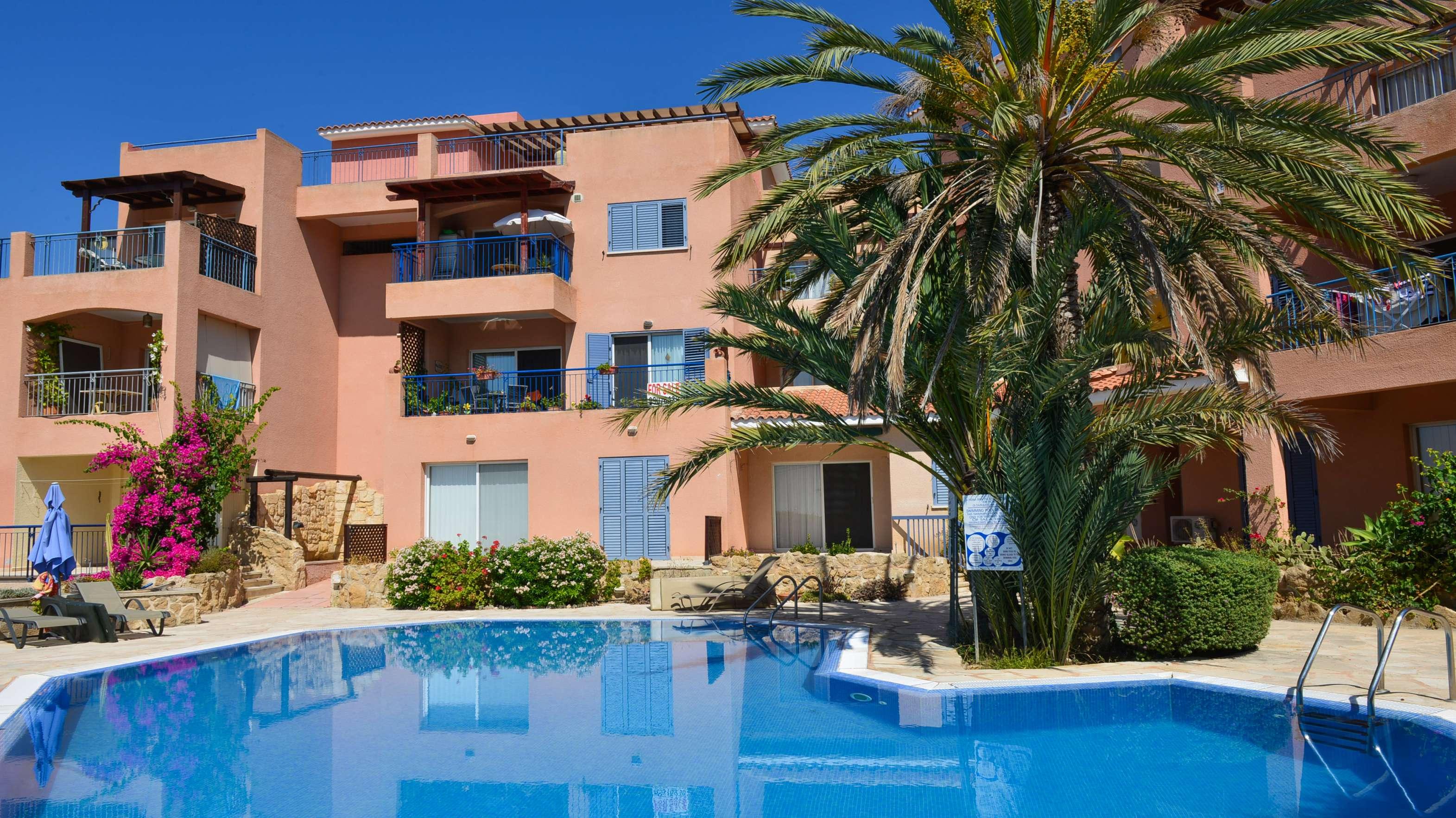 Apartments and townhouses in a community with landscaped gardens and lagoon-style swimming pool