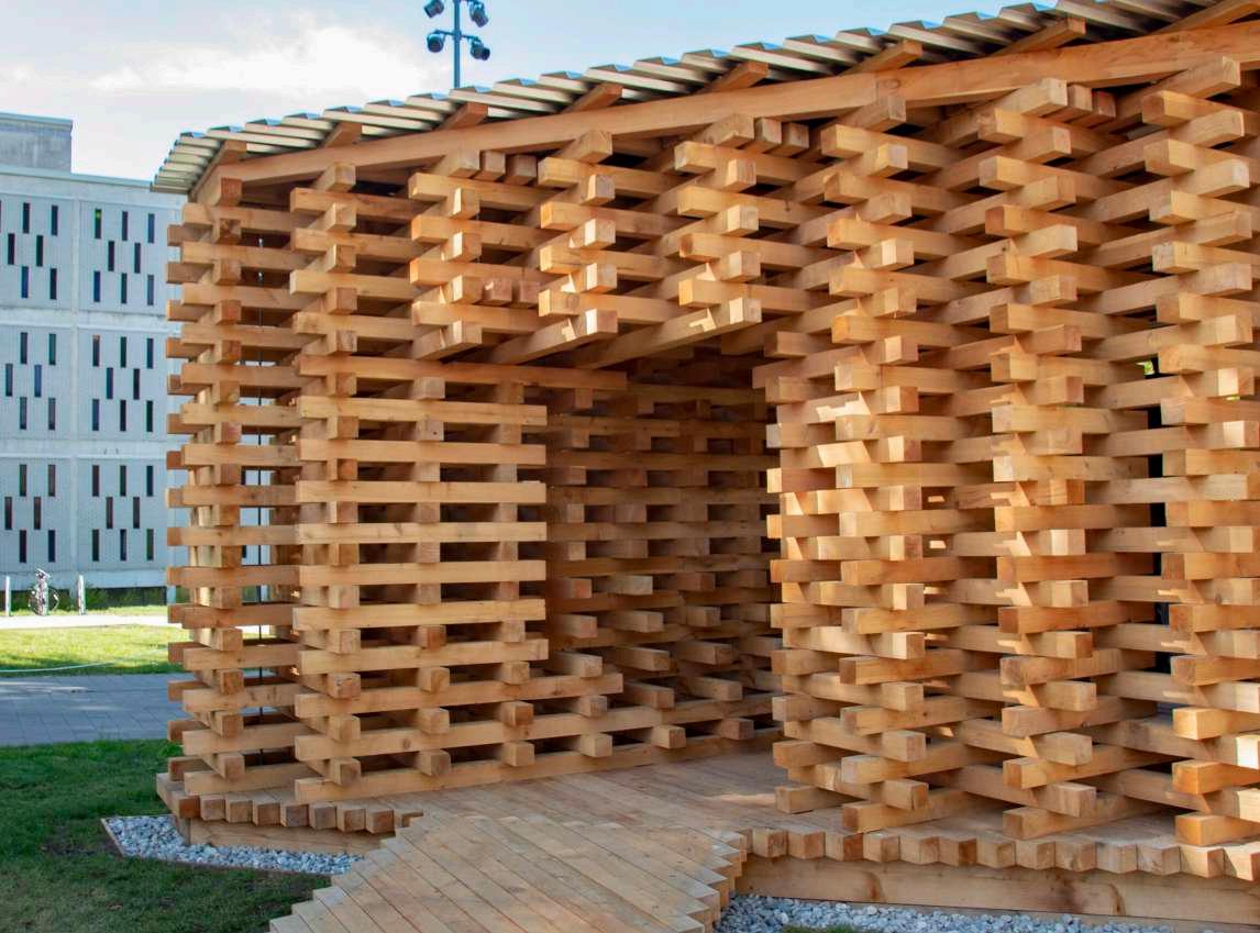 The pavilion showcases the design principles of ZXC alongside CVP’s carpentry expertise. Situated in a prime location at the exhibition, the pavilion adopts a semi-circular shape, responding to the pedestal it sits on. This shape frames the view of the performing space below, and its symmetry allows for easy fabrication in modular units.