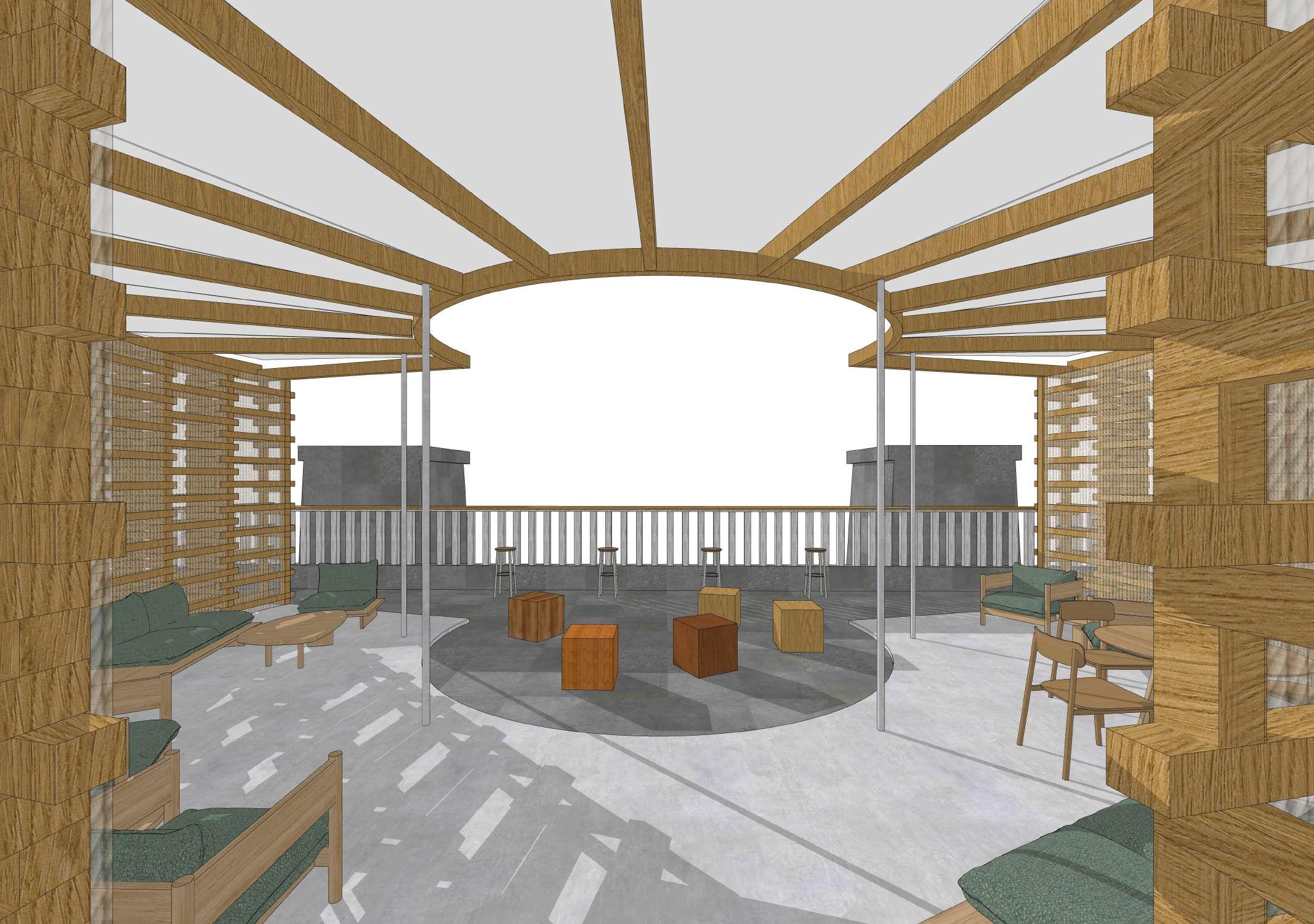 ‘U’ shaped plan gives a strong presence from the entrance area with the facade, and opens views out over the lake and performance square. The external wall is made from stacked timber furniture components, showcasing CVP’s core material. The inside wall of the covered area is lined with white synthetic weave to give a neutral backdrop to the furniture on display. The Central open-air space is used to display Outdoor Furniture but can also serve as a Gathering Space, taking advantage of the location overlooking the Lake and Performance area.