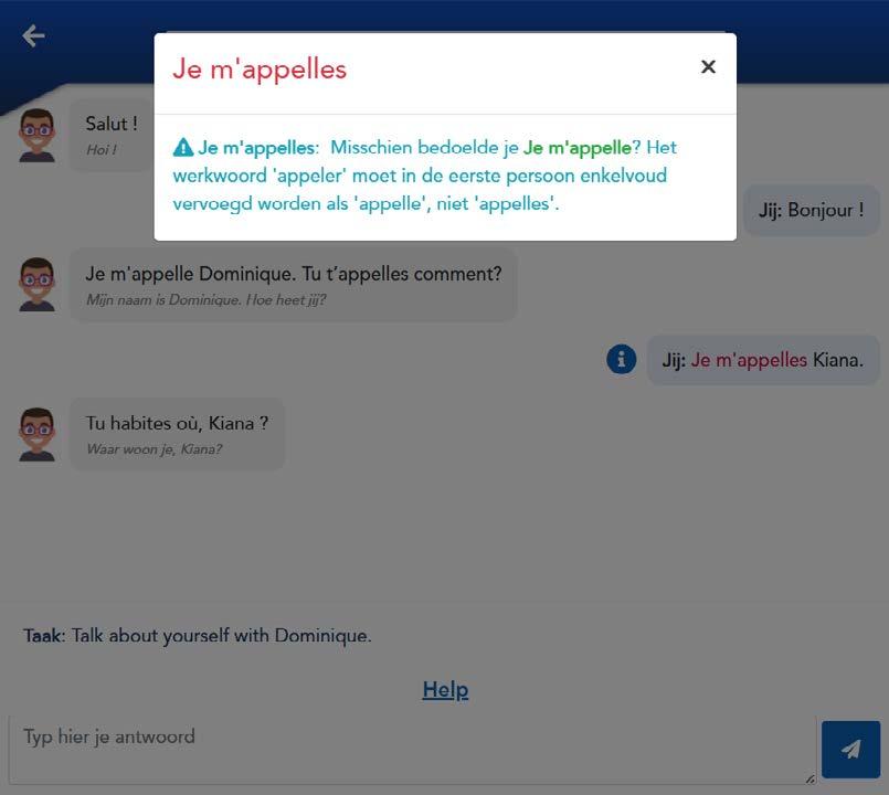 Laat je leerlingen chatten met de interactieve chatbot (zoals WhatsApp conversaties). Zo oefen je schriftelijke interactie.