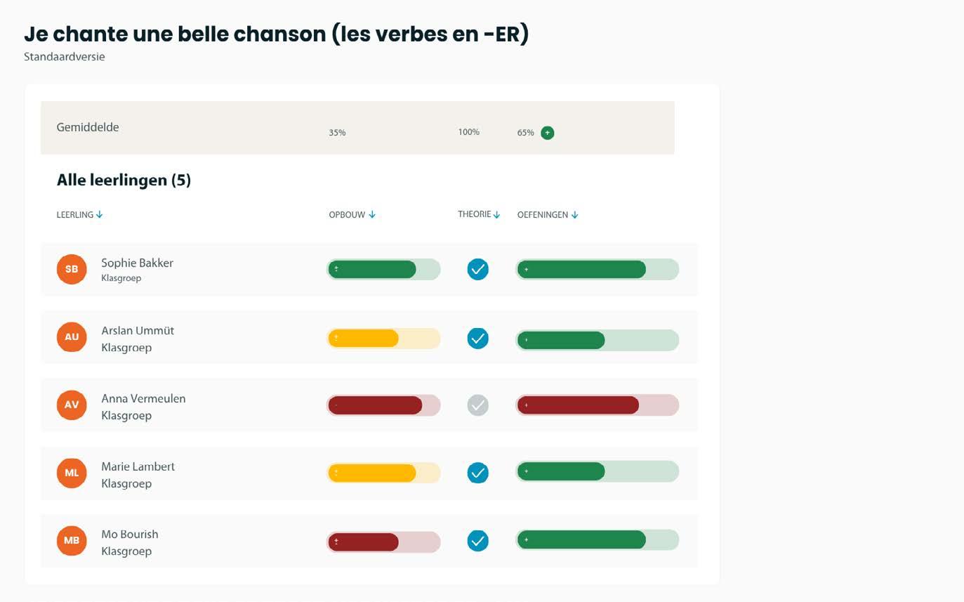 Je kunt gemakkelijk de vooruitgang van je leerlingen opvolgen met behulp van de knop ‘Opvolging’. Op die manier kun je in het dashboard meteen zien welke leerstof ze beheersen en waar ze extra ondersteuning nodig hebben. In Lernova Frans kan je klasoverstijgende groepen maken, zodat je leerlingen lesmateriaal op maat kan aanbieden en hen vlot kan opvolgen. Je leerlingen gaan zelfstandig aan de slag, terwijl jij snelle, contextuele begeleiding geeft.