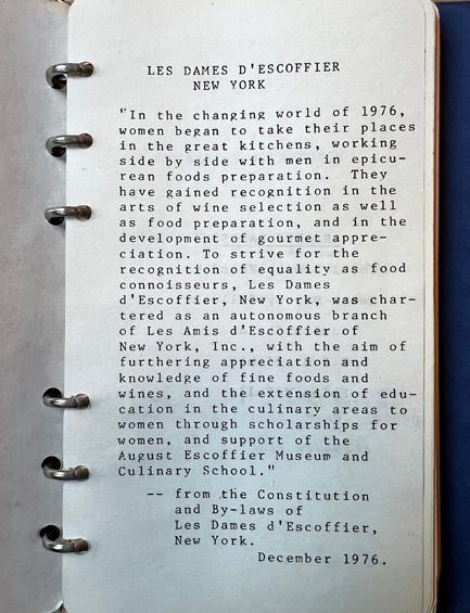 “Dame Carole Brock, after intense, international networking, received a charter for Les Dames d’Escoffier in 1973. Dames Helene Bennett, Sylvia Schur-Domoto, Beverly Barbour-Soules, Ella Elvin, and Mary Lyons aided her in this effort.” —Dame Abigail Kirsch (New York), International Board President, 2000.