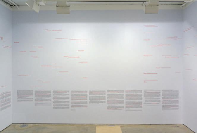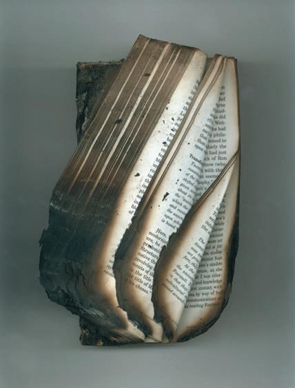 espace donné, au sens propre comme au sens figuré. Le livre ouvert représente pour moi un espace de pensée – en allemand, on utilise le terme Denkzimmer (littéralement « chambre de réflexion »), mot qui désigne un espace clos dans lequel s’enfermer et réfléchir à l’abri de toute distraction (ce qui me semble une utopie) –, un espace qui permet d’ouvrir sur l’imaginaire, un espace à explorer, jamais vraiment fixé. En même temps, une fois fermé, le livre redevient un simple réceptacle, imprimé, et donc figé dans le temps et l’espace. C’est une belle contradiction, car le simple fait de tourner les pages d’un livre implique une interaction, une séquence d’actions qu’on connait bien, appelée par la forme générique du livre, des gestes à partir desquels on peut développer une réflexion. Il y a aussi cette référence au dispositif du livre dans mon travail photographique. Je pense ici à la série Privation (2001). Formée de numérisations sans captation photographique – c’est d’ailleurs la première série d’images numériques que j’ai réalisée –, elle montre la première et la quatrième de couverture de certains livres que j’avais et qu’un incendie a endommagés. Ils sont ici devenus impénétrables, du moins sur le plan métaphorique, parce qu’ils ont été reproduits sous forme d’images. Mon plus récent travail, The Empty S(h)elf, offre un autre aspect de cette exploration sur le livre. Par la première itération de cette série, exposée à Artexte en 2019, j’ai tenté de considérer l’espace d’exposition comme la spatialisation d’un livre. Inspirée par un passage d’une nouvelle de Jorge Luis Borges portant sur l’architecture d’une bibliothèque infinie, je n’avais reproduit aucun texte principal au mur (aucune de ces présentations normalement caractérisées par des blocs ou des colonnes entières de texte), tandis que d’innombrables citations sous forme de notes de bas de page parcouraient la pièce. L’absence et la présence sont toutes deux des dispositifs stratégiques qui laissent au lecteur/spectateur ou à la lectrice/spectatrice le soin d’établir la signification du texte. L’ajout d’images photographiques (que j’avais produites ou trouvées) et d’une vidéo m’a permis de mettre en lumière, dans cette exposition, certaines préoccupations telles que les changements dans nos habitudes de lecture ou l’incidence d’Internet sur notre façon de penser, qui est modifiée par lui.