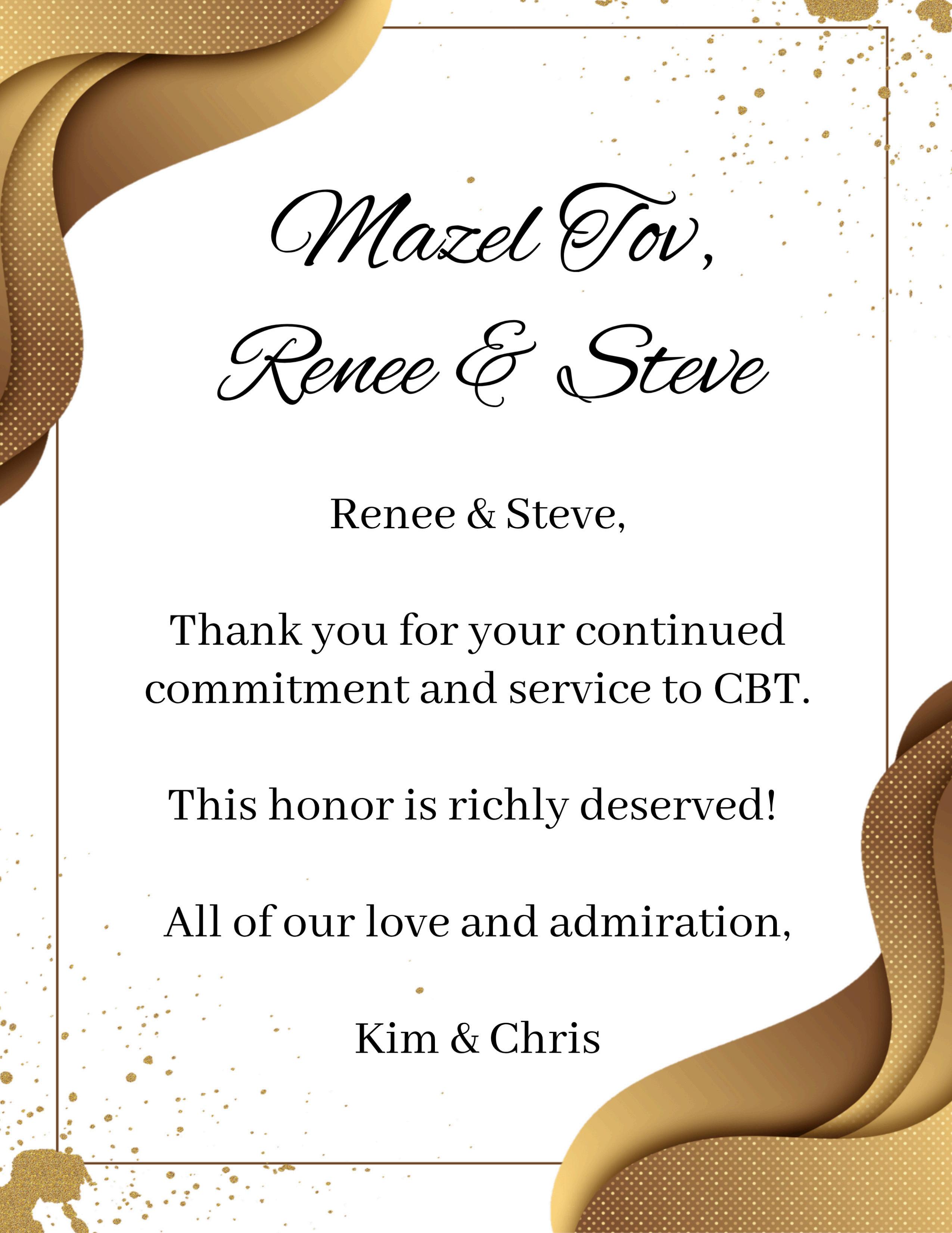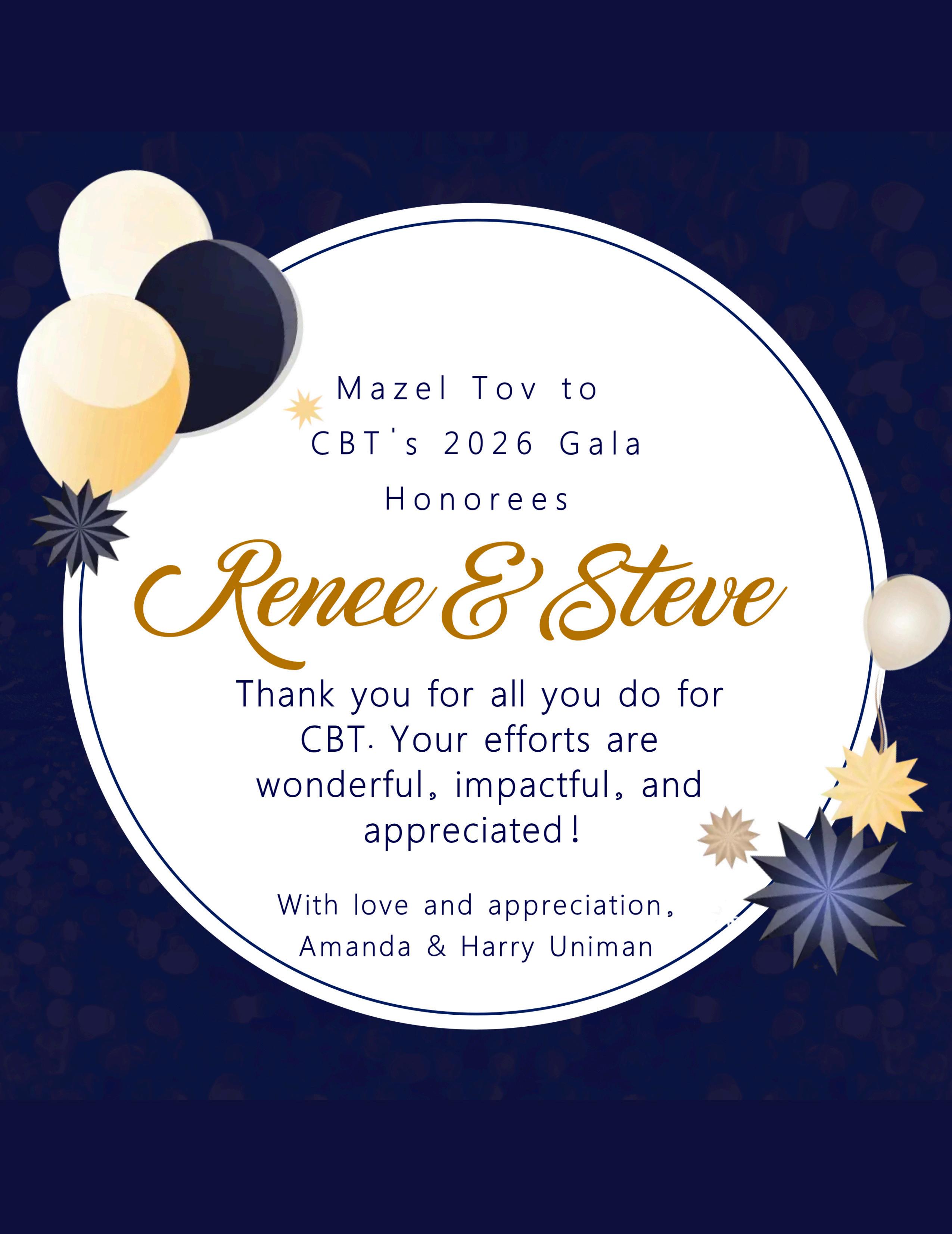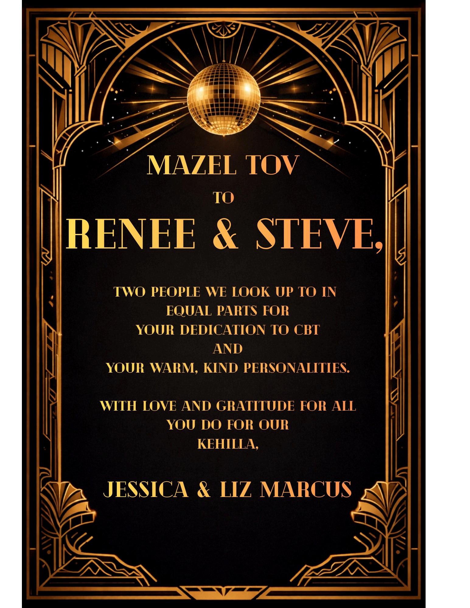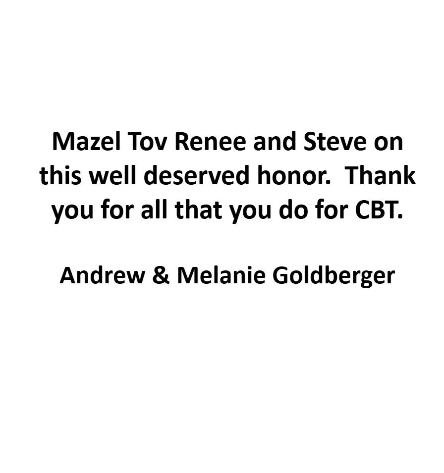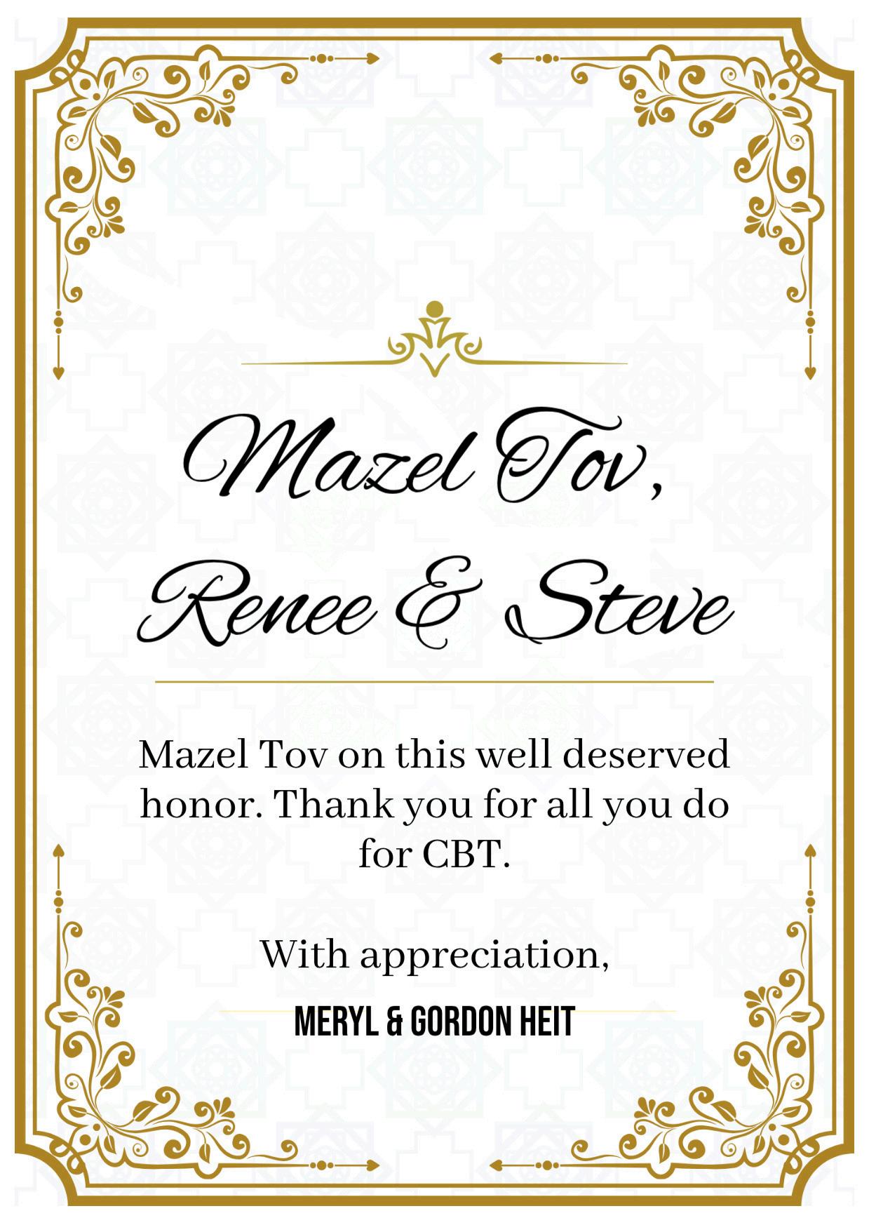 From one Renée and Steve to the other Renee and Steve: Mazel tov to a remarkable couple whose dedication strengthens our synagogue and inspires us all. Thank you so much for all that you do for CBT!