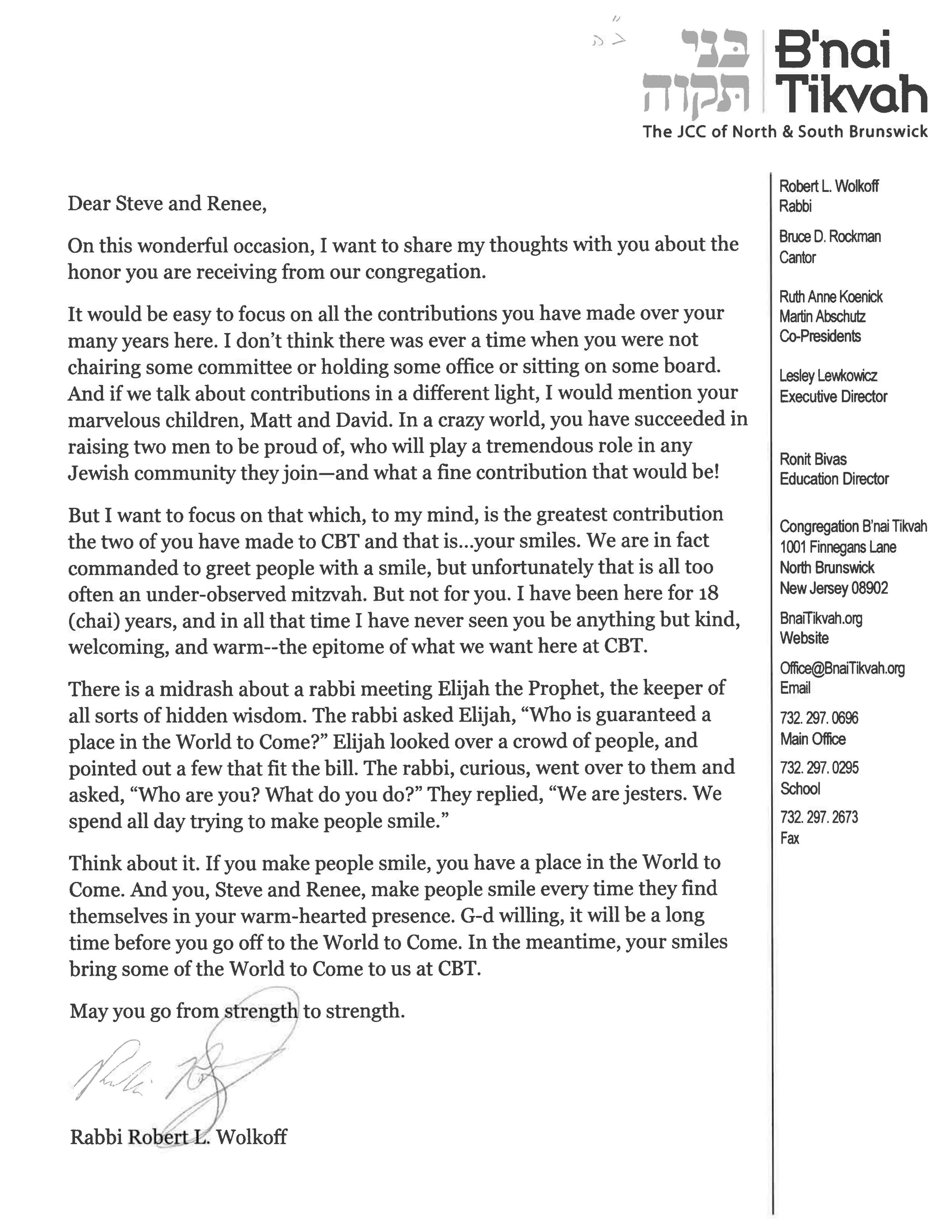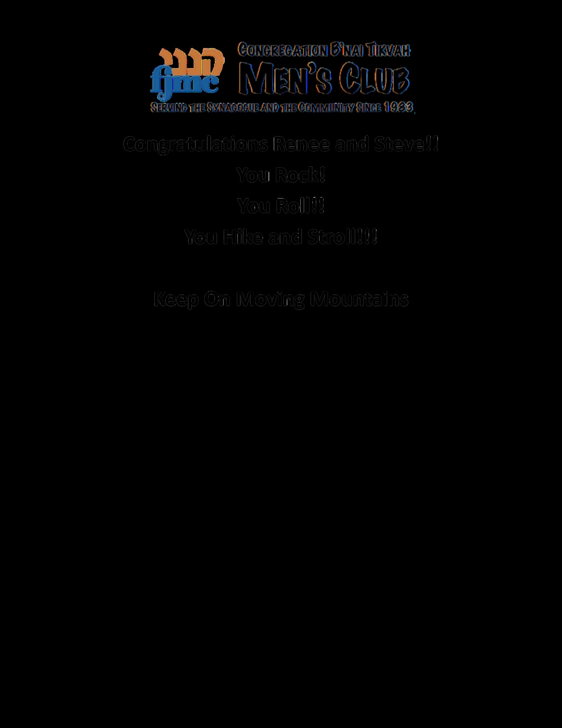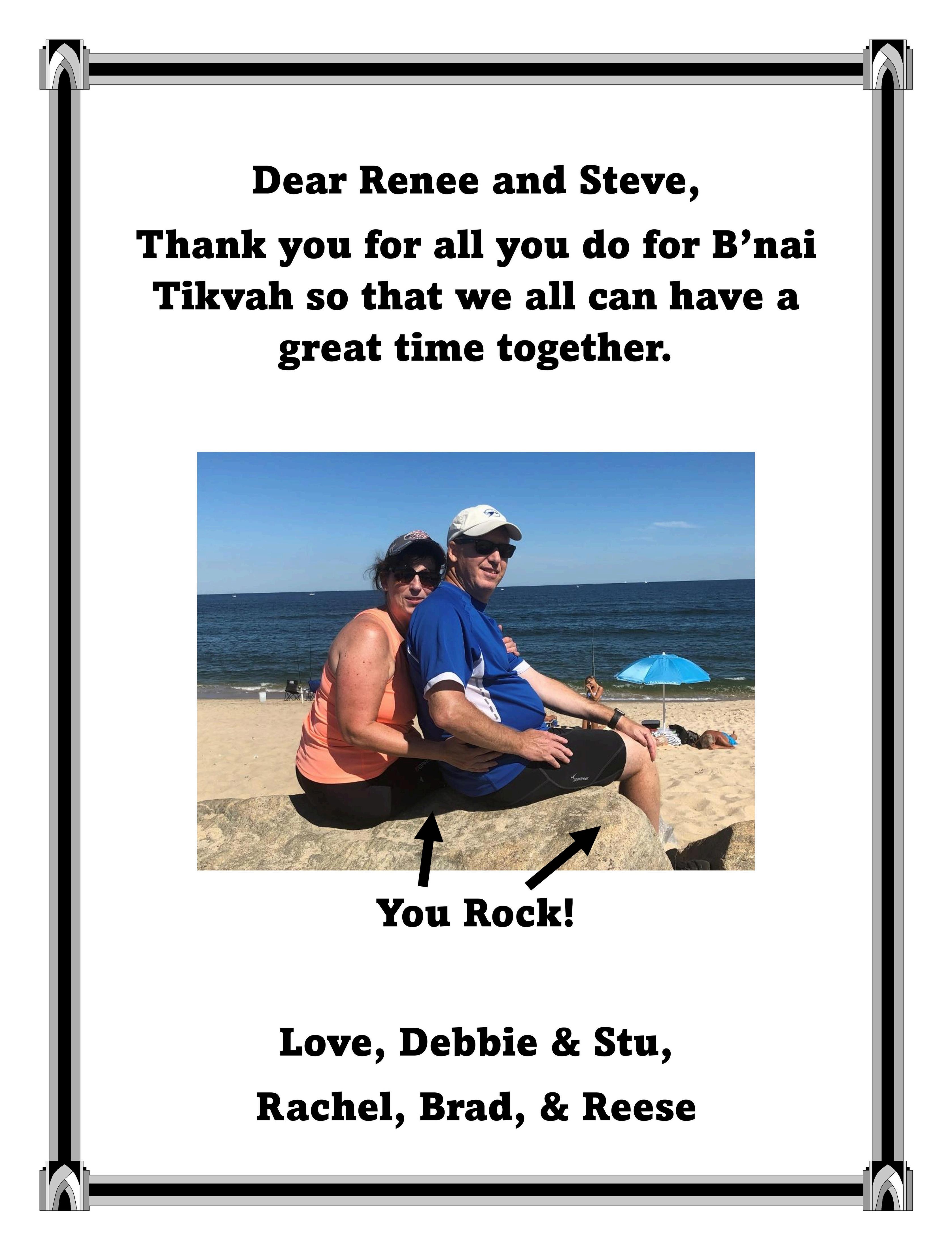 Congratulations Renee & Steve on this well deserved recognition. Your dedication to Congregation B’nai Tikvah is truly inspiring and outstanding. With love and gratitude Joyce & Joel Gerbman.