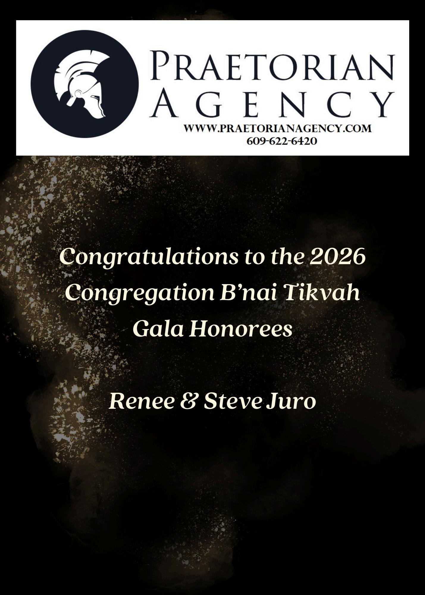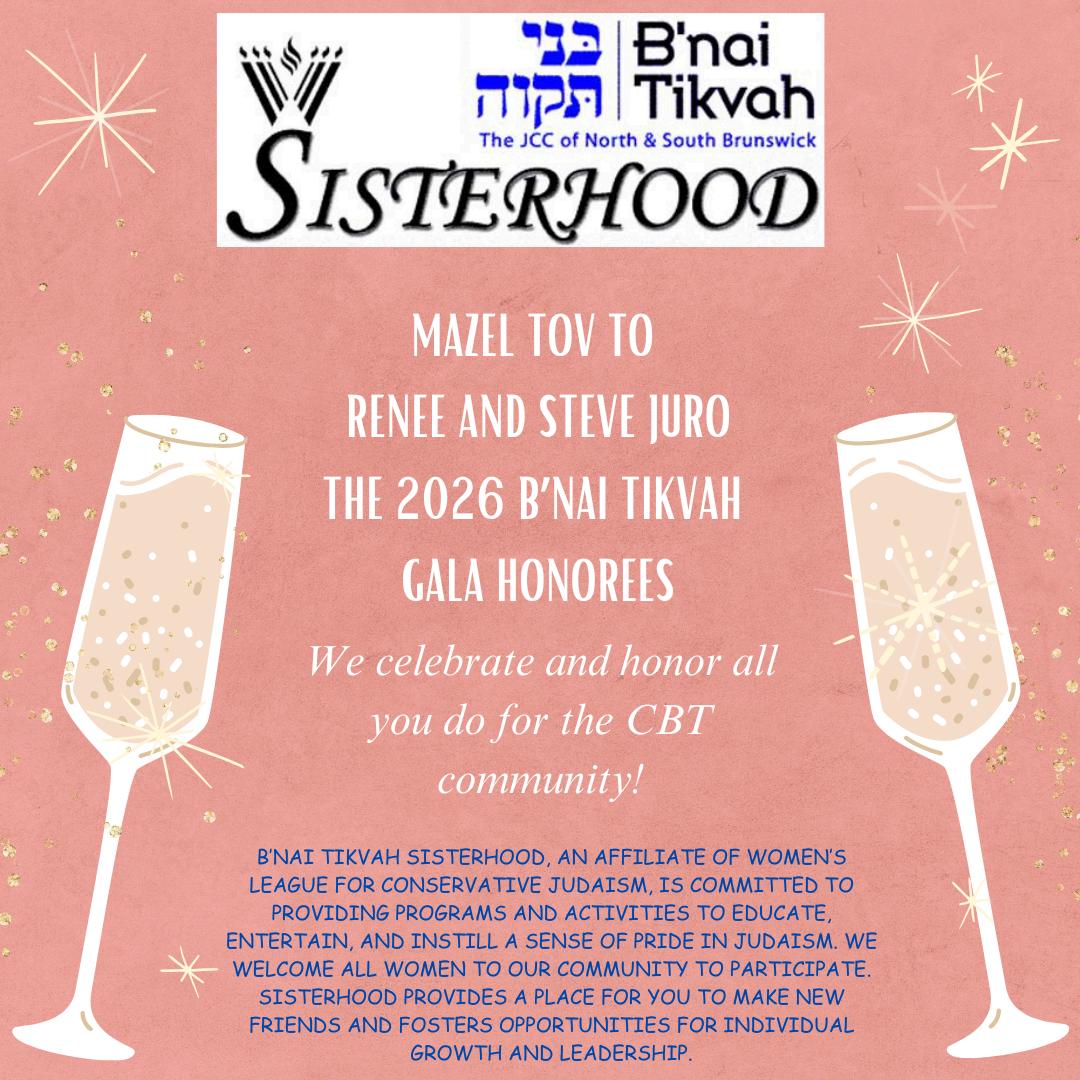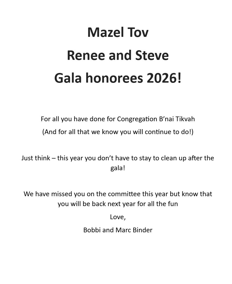 Tonight we honor an incredibly deserving couple, Renee and Steve Juro. If you know the Juros, it is quite obvious why these two were chosen to be Congregation B’nai Tikvah’s 2026 Gala Honorees!