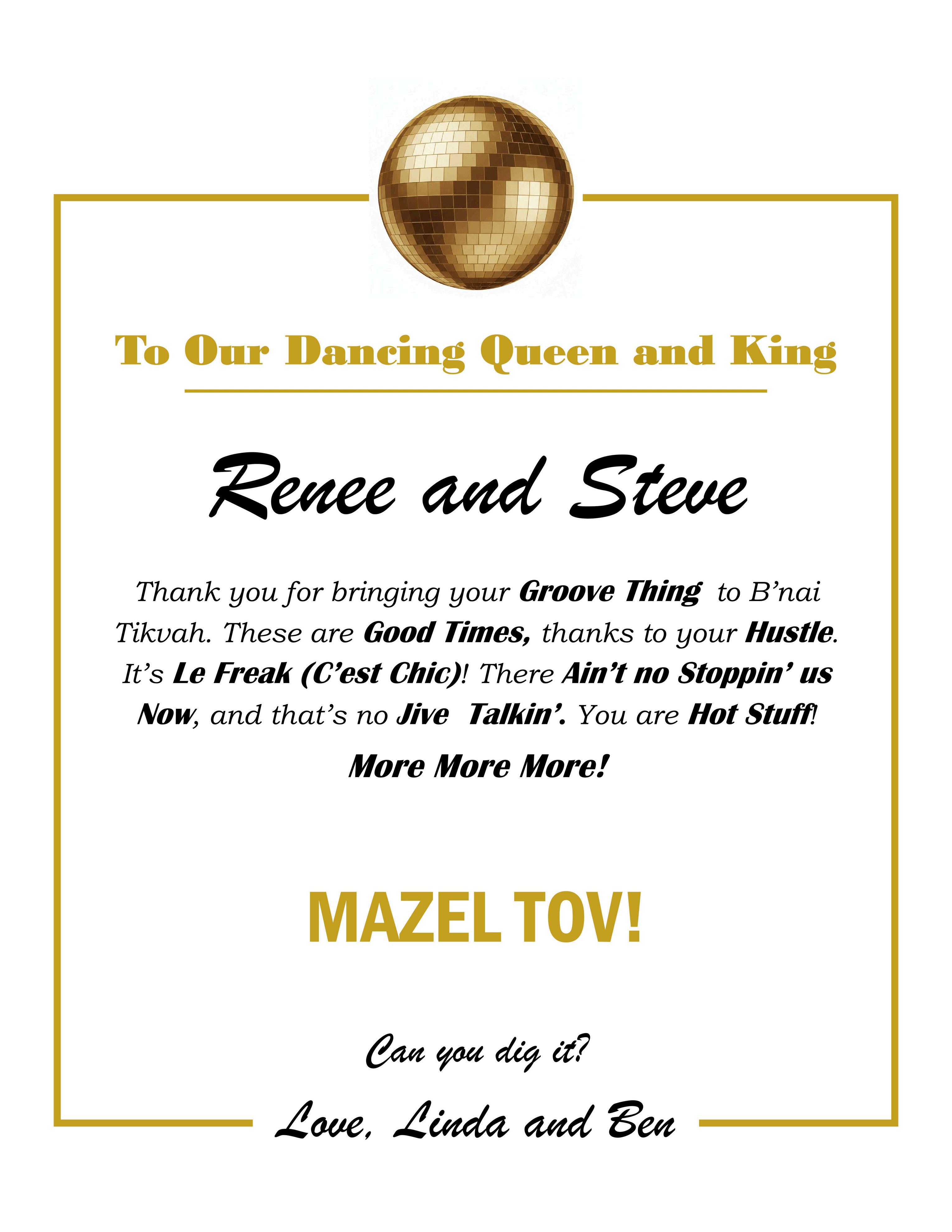 Renee & Steve: Mazel Tov on this wonderful honor. We hope that you have a great evening, surrounded by loved ones, eat & drink to your hearts content, and dance until your feet hurt!