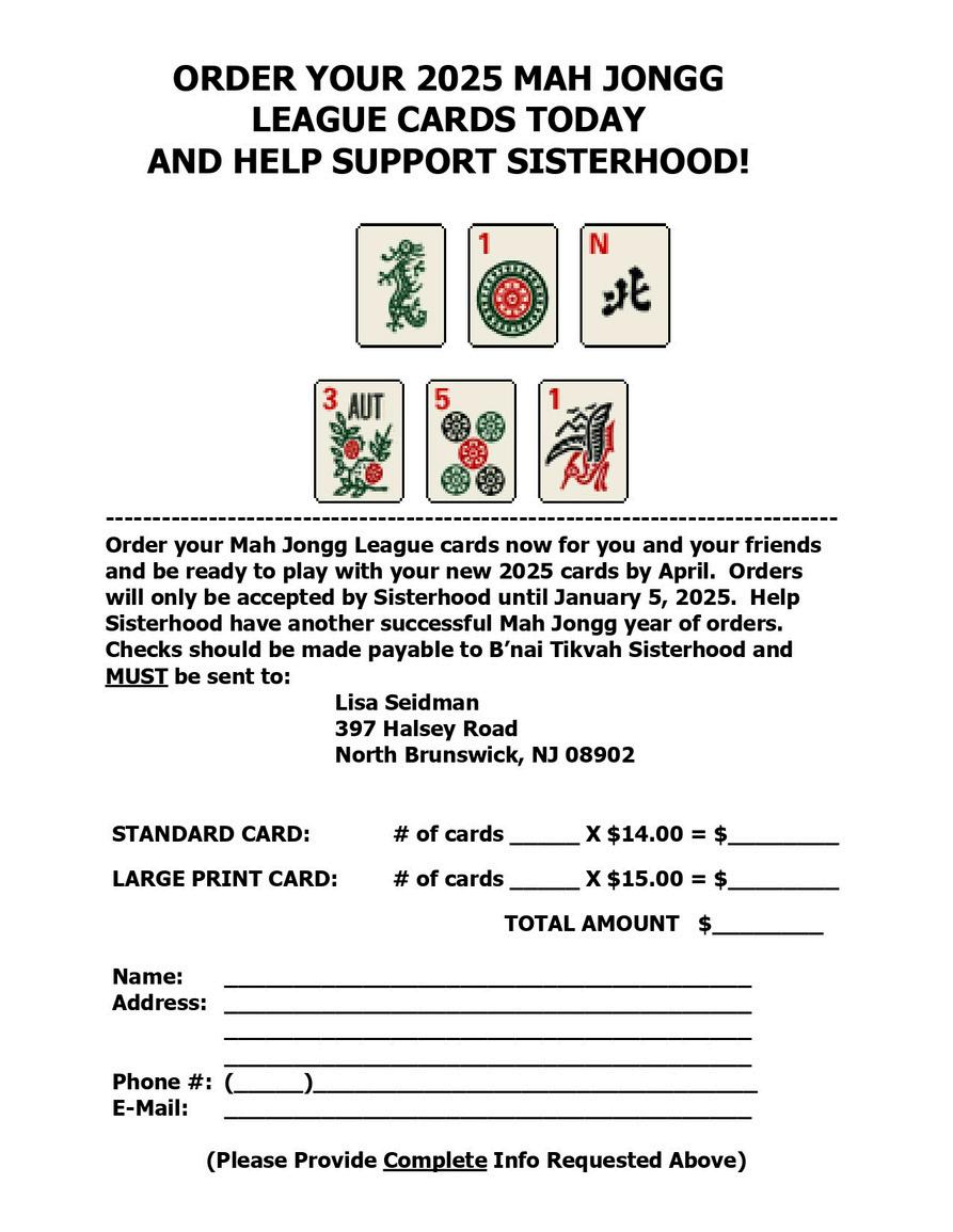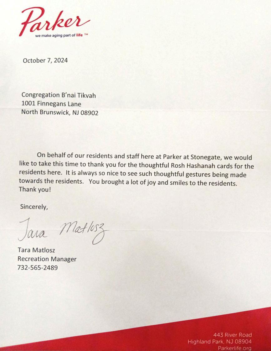 This Rosh Hashanah, Sisterhood partnered with the CBT Religious School students to create beautiful New Year’s cards. These cards were distributed to the seniors at four local assisted living facilities: Parker at Landing Lane, Sunrise of East Brunswick, Mira Vie at East Brunswick and Care One at East Brunswick. The residents at each facility were so thankful for the contribution from our children.