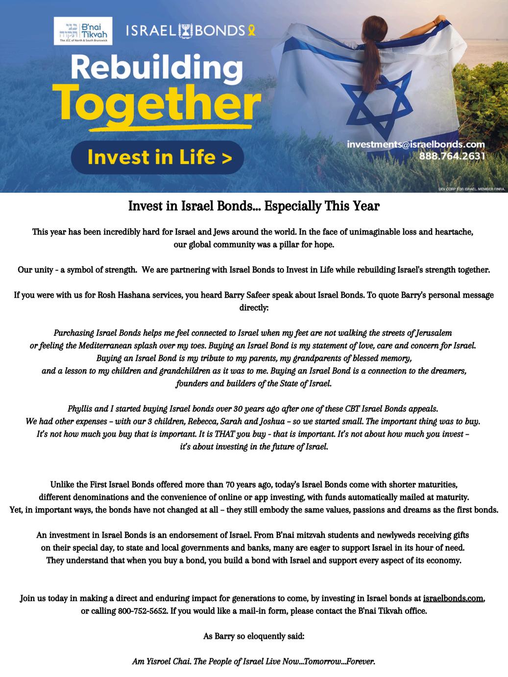 On behalf of the entire leadership and clergy of Congregation B’nai Tikvah, we extend our deepest thanks for your continued support. May we go from strength to strength, and may the year ahead be filled with peace, prosperity, and blessings for us all. G’mar Chatimah Tovah may you be sealed in the Book of Life.