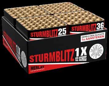 De Donnerblitz van Herlat bevat 76 schoten van het grootste kaliber met een maximale kruitvulling van 25 gram per schot. 4 cakes.