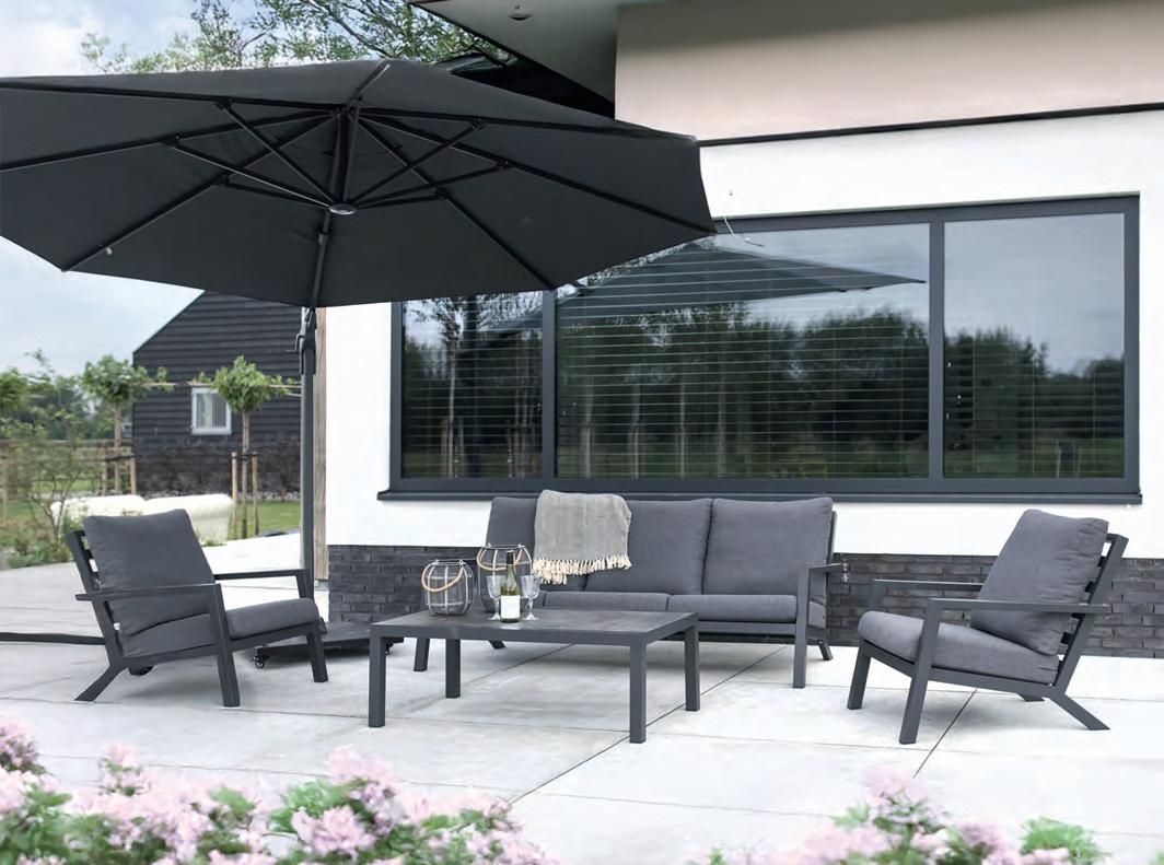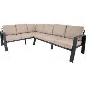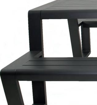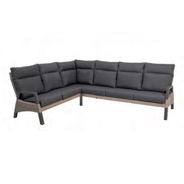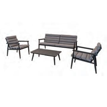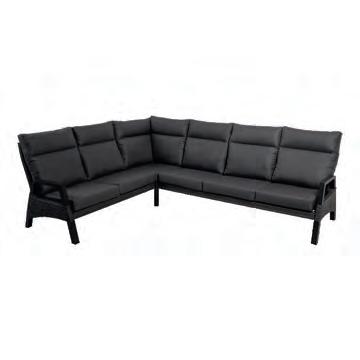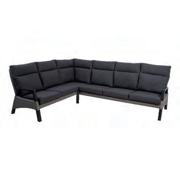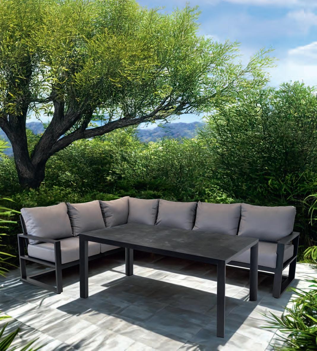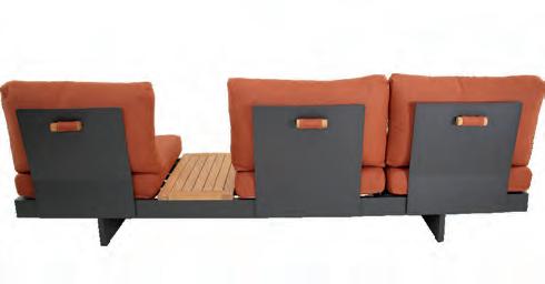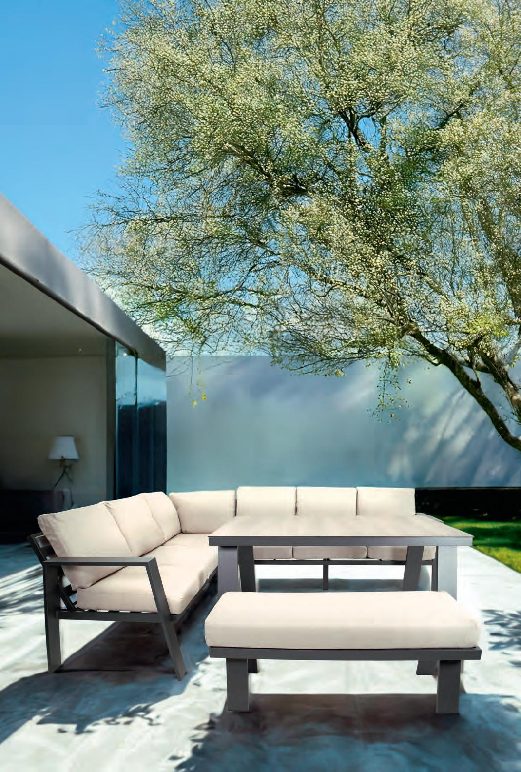 Bench 3-seat with right arm 244x79∕83,5x60cm | Bench 3-seat with corner 256x79∕83,5x60cm | 1x high coffee table 102x80x35cm | 1x low coffee table 102x80x26cm | Aluminium frame matt anthracite | 270gr∕m2 olefin cushion | Top: SPC