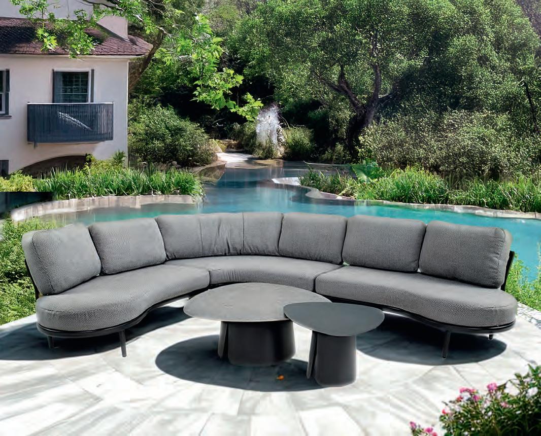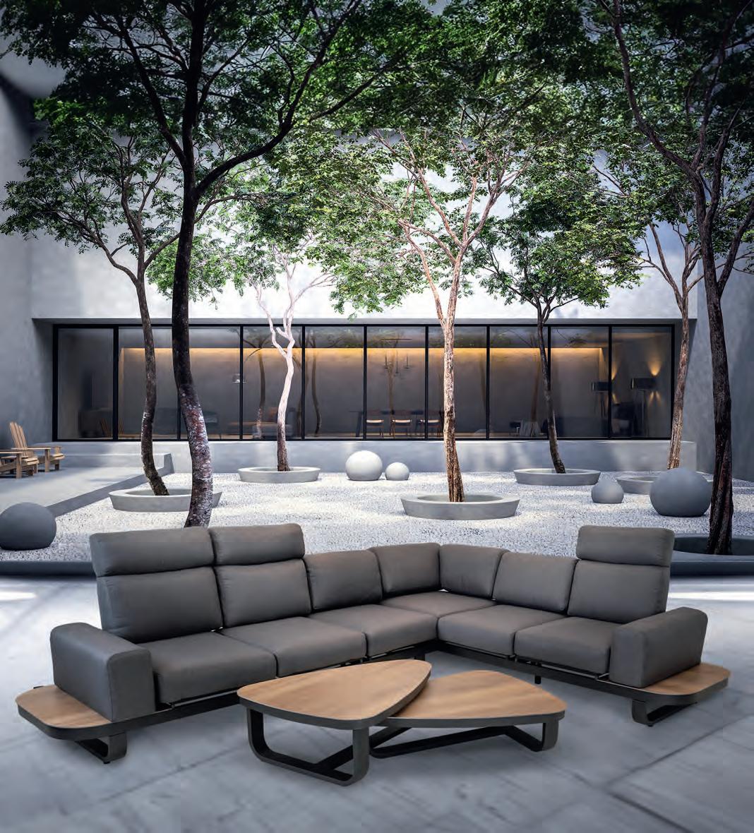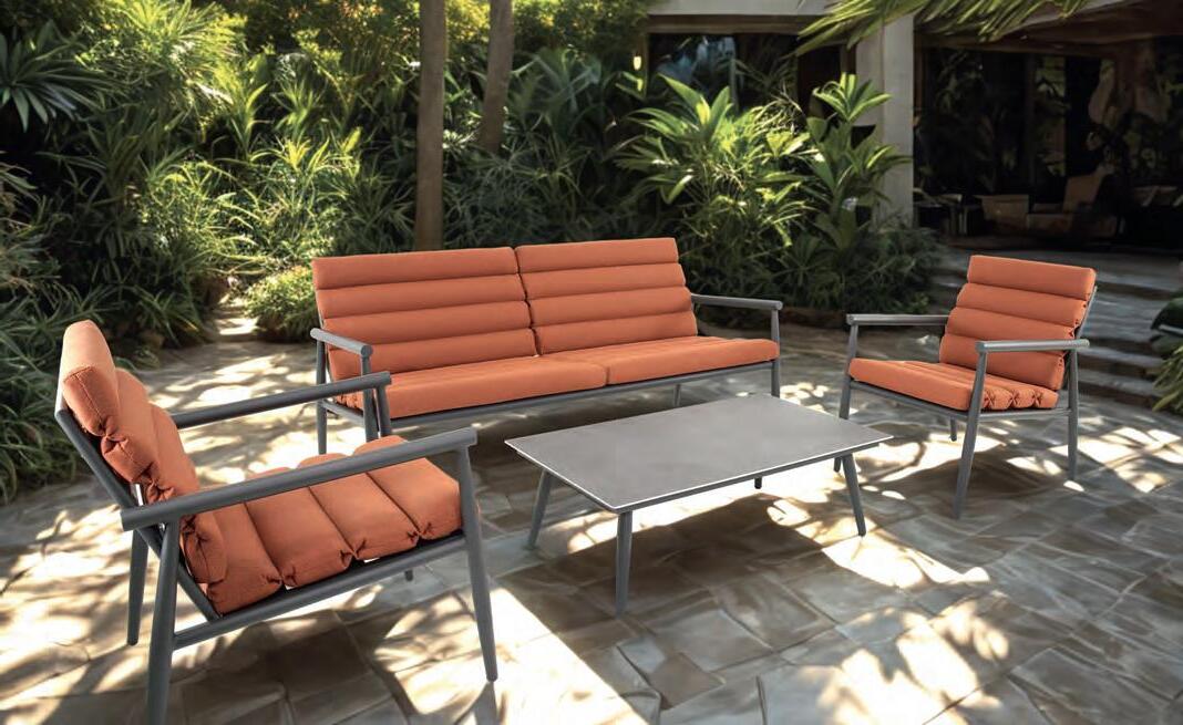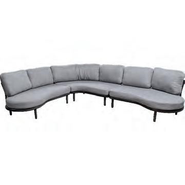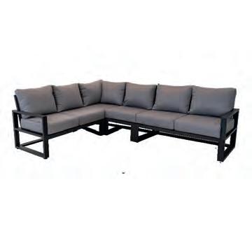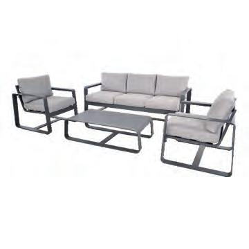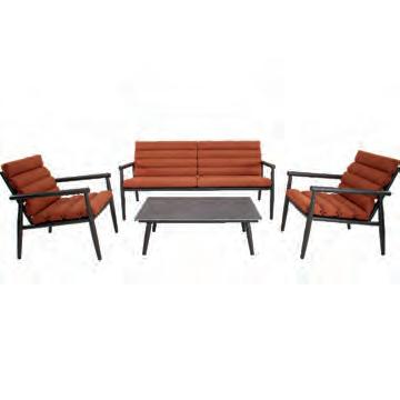 Bench 3-seat with right arm 244x79∕83,5x60cm | Bench 3-seat with corner 256x79∕83,5x60cm | 1x high coffee table 102x80x35cm | 1x low coffee table 102x80x26cm | Aluminium frame matt anthracite | 270gr∕m2 olefin cushion | Top: SPC