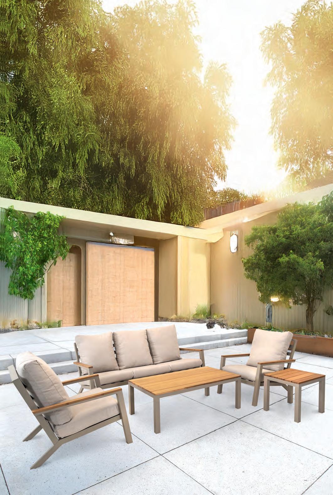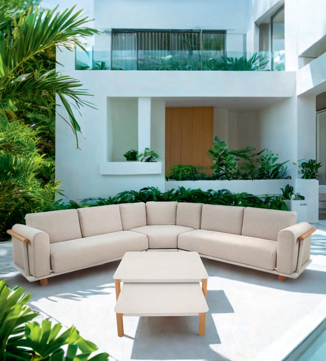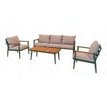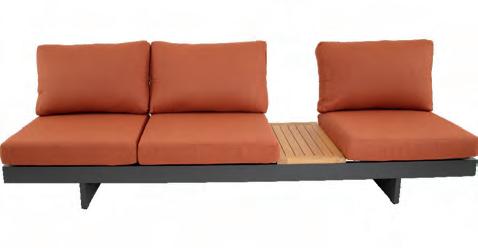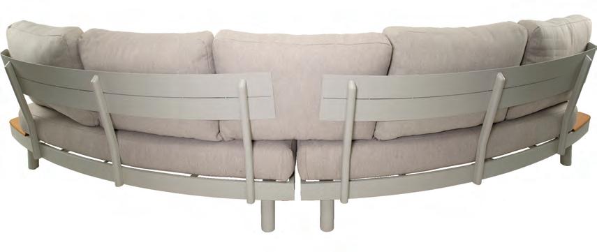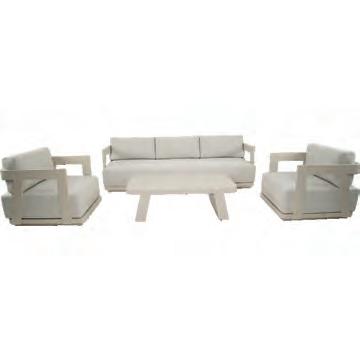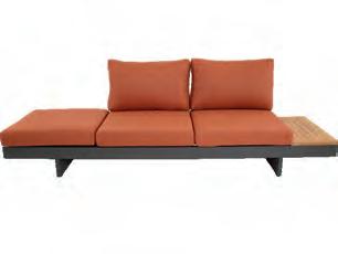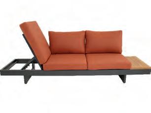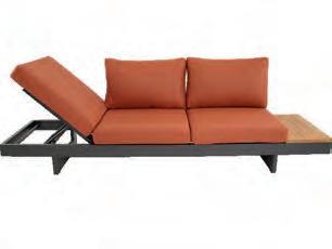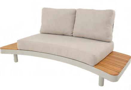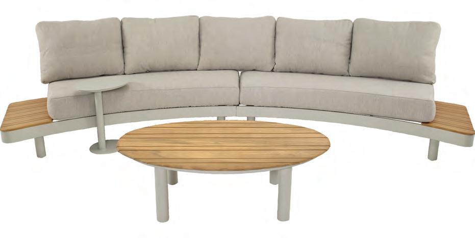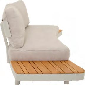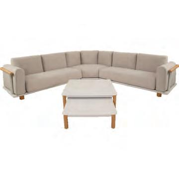 Left 2-seater 192,5x92∕72x75cm | Right 2-seater 192,5x92∕72x75cm | 2-seater with 2 side tables 200x100∕74x75cm | Coffee table 110x69x35cm | Side table 45x33x50cm | Aluminium frame matt beige | 370gr∕m² olefin cushion | Top: Teak