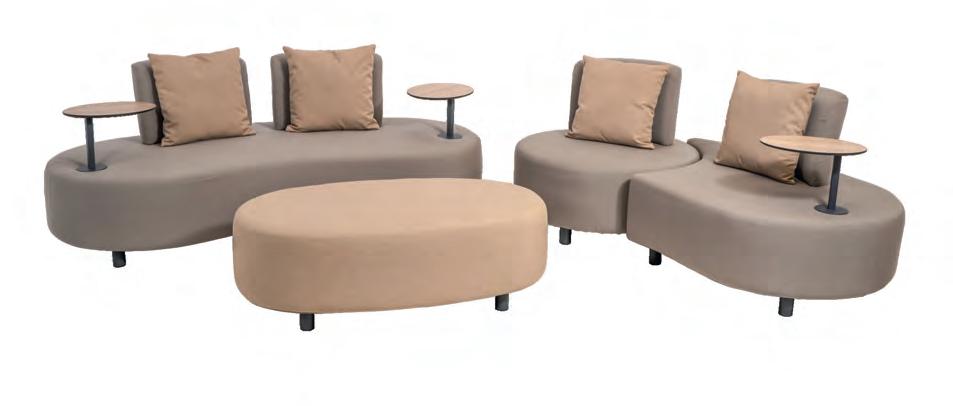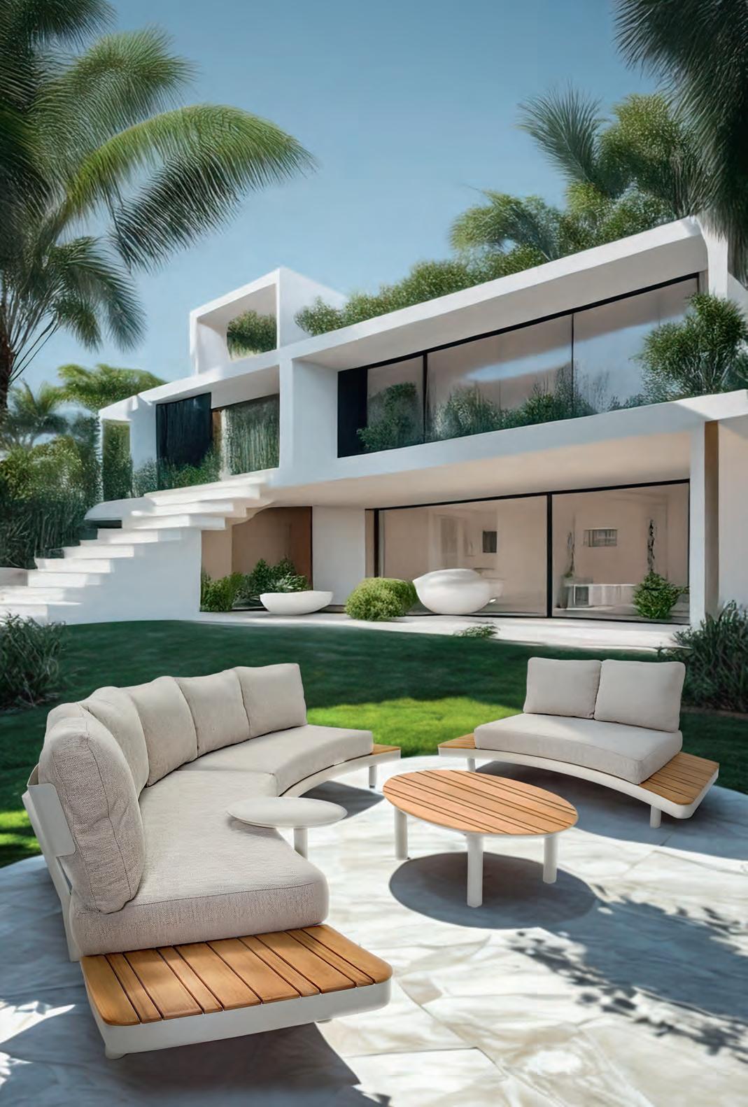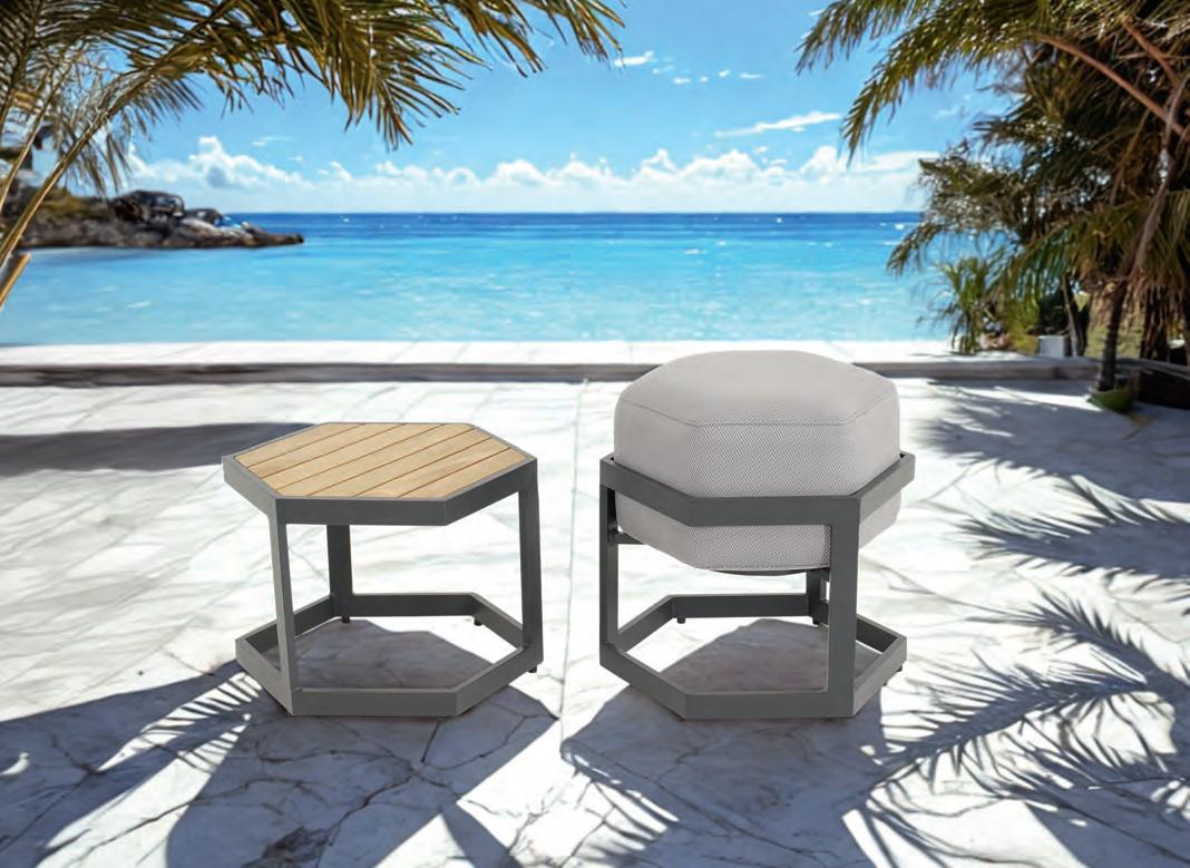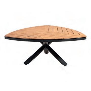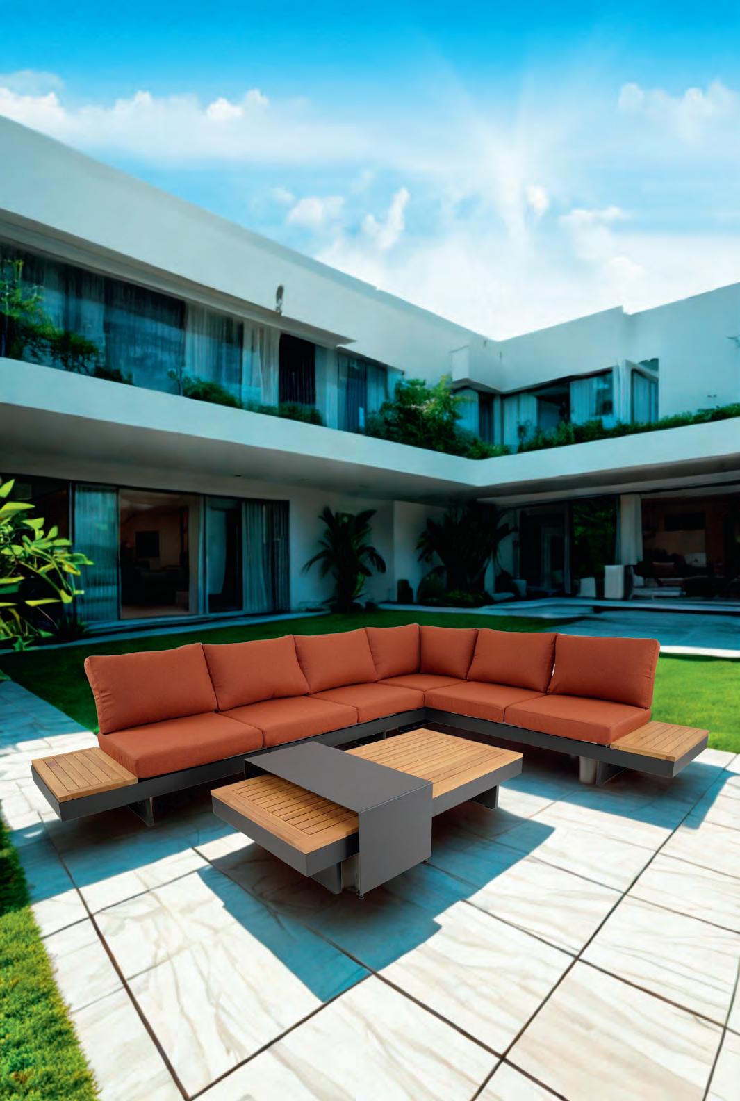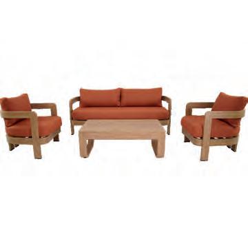 Left 2-seater 192,5x92∕72x75cm | Right 2-seater 192,5x92∕72x75cm | 2-seater with 2 side tables 200x100∕74x75cm | Coffee table 110x69x35cm | Side table 45x33x50cm | Aluminium frame matt beige | 370gr∕m² olefin cushion | Top: Teak