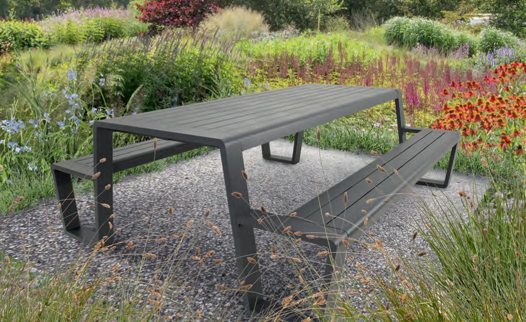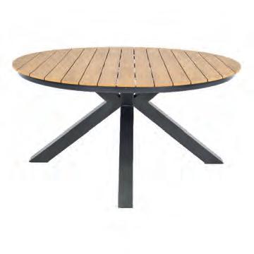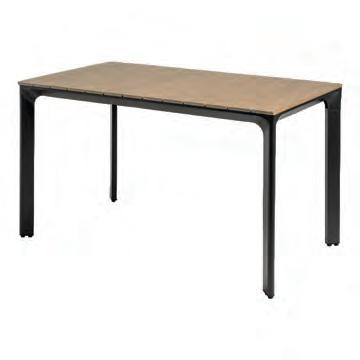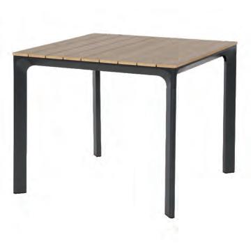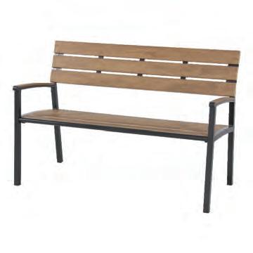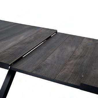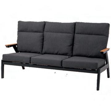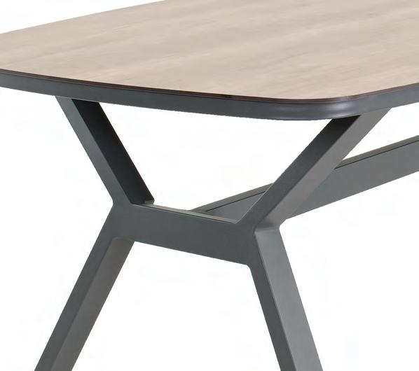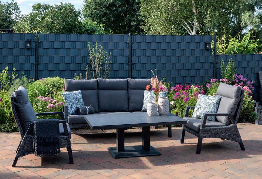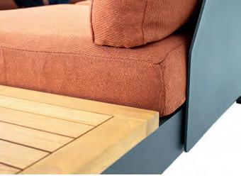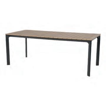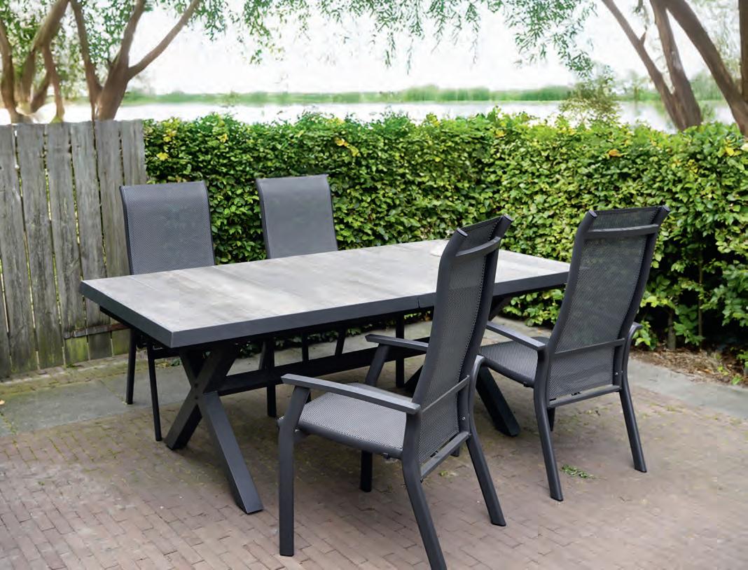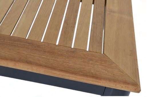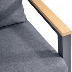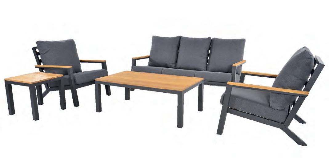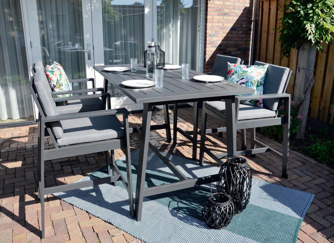 Chair 77x81x75cm | Bench 207x81x75cm | Table 120x65x34cm | Aluminium frame matt anthracite | 240gr∕m² olefin cushion | Top: aluminium slats, wood look
