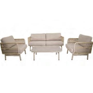 Chair 79x75x66cm | Bench 179x75x66cm | Table 110x60x35cm | Aluminium frame matt beige | Ø6mm rope color beige | 240gr∕m² olefin cushion | Top: 5mm printed glass