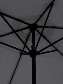 Onderhoud en reiniging: indien u de parasol grondig wilt reinigen, gebruik dan een spons en een zeem. Begin door de parasol nat te spuiten met een tuinslang. Gebruik geen hogedrukreiniger of agressieve schoonmaakmiddelen aangezien deze de water- en vuilwerende coating kunnen beschadigen.