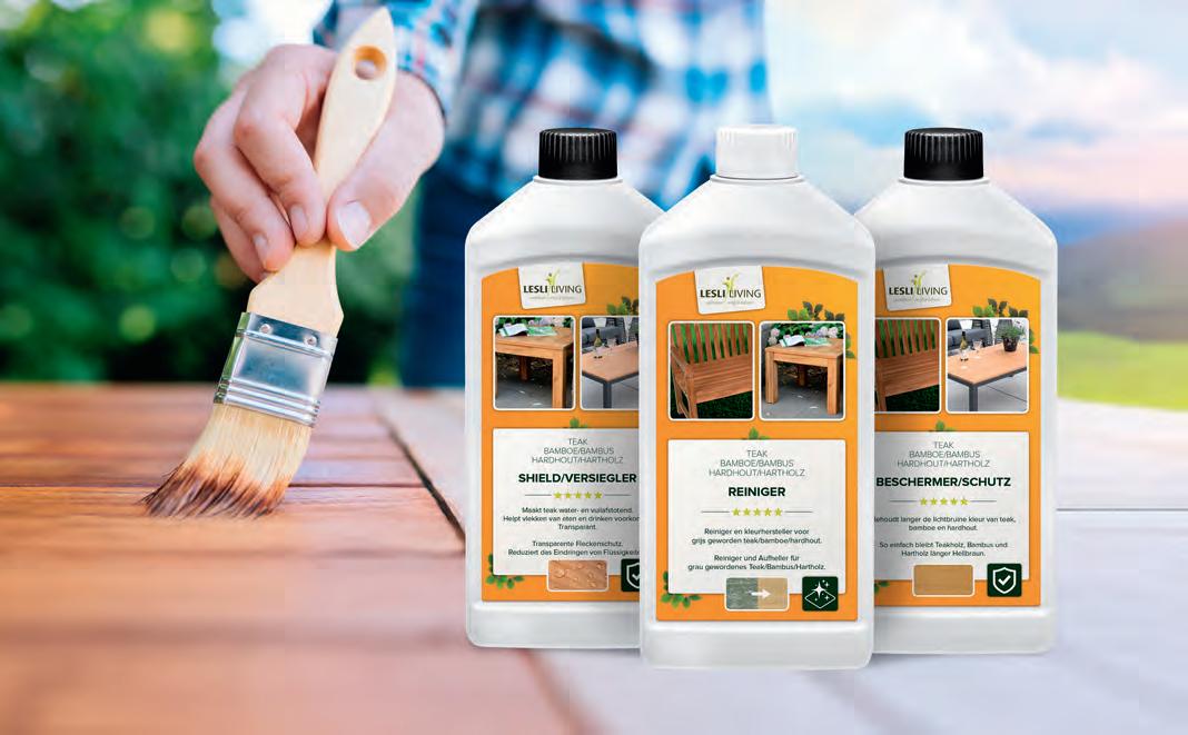 TEAK Teakholz ist ein tropisches Hartholz, das für sein natürliches Aussehen und seine Vielseitigkeit bekannt ist. Unbehandeltes Teak hat eine warme, honigbraune Farbe und weist kleine Haarrisse oder Oberflächenrisse auf. Diese Risse haben jedoch keinen Einfluss auf die Lebensdauer des Holzes. Dank des natürlichen Ölgehalts ist Teak eines der hochwertigsten Hölzer für den Außeneinsatz und bietet eine lange Lebensdauer. Wenn unbehandeltes Teak den Witterungsbedingungen ausgesetzt wird, verändert sich der honigbraune Farbton allmählich in die charakteristische silbergraue Farbe. Möchten Sie die ursprüngliche Farbe erhalten? Behandeln Sie Ihre Möbel dann mit unserem Teakreiniger, Protector und Shield. Pflege und Reinigung: Reinigen Sie mit einer weichen Bürste und Wasser. Für eine gründlichere Reinigung verwenden Sie den Teak-, Bambus- und Hartholzreiniger (Art. 74970). Um die Farbe zu erhalten, eignet sich der Protector (Art. 74971). Für zusätzlichen Schutz verwenden Sie das transparente Shield (Art. 74973).