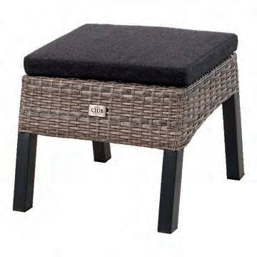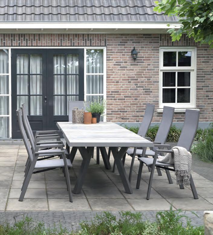 Chair 75x72,5x66cm | Bench 185x72,5x66cm | Table 110x60x41cm | Aluminium frame wood look | 277gr∕m² olefin cushion | Top: aluminium